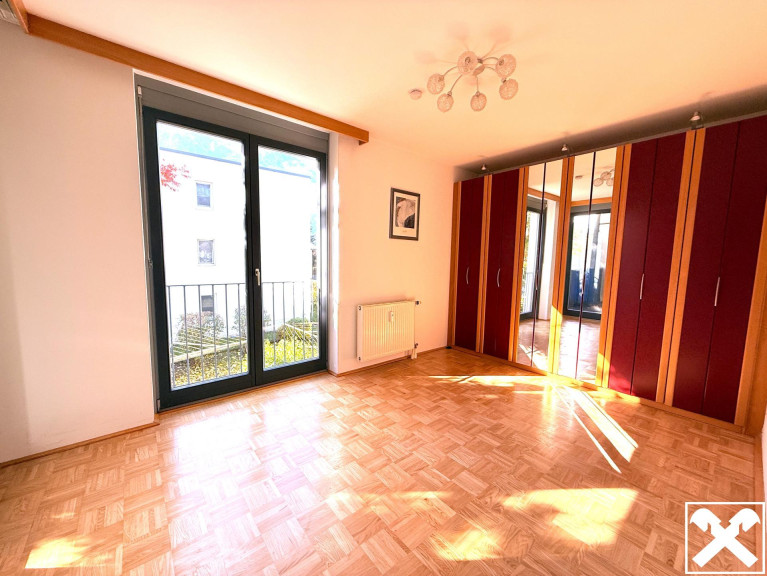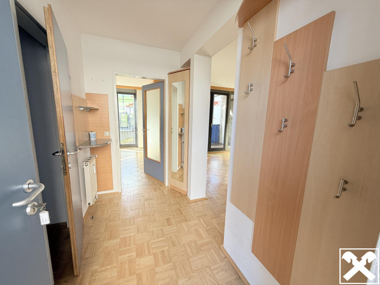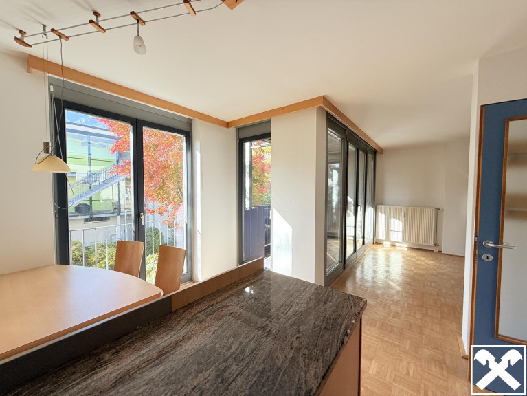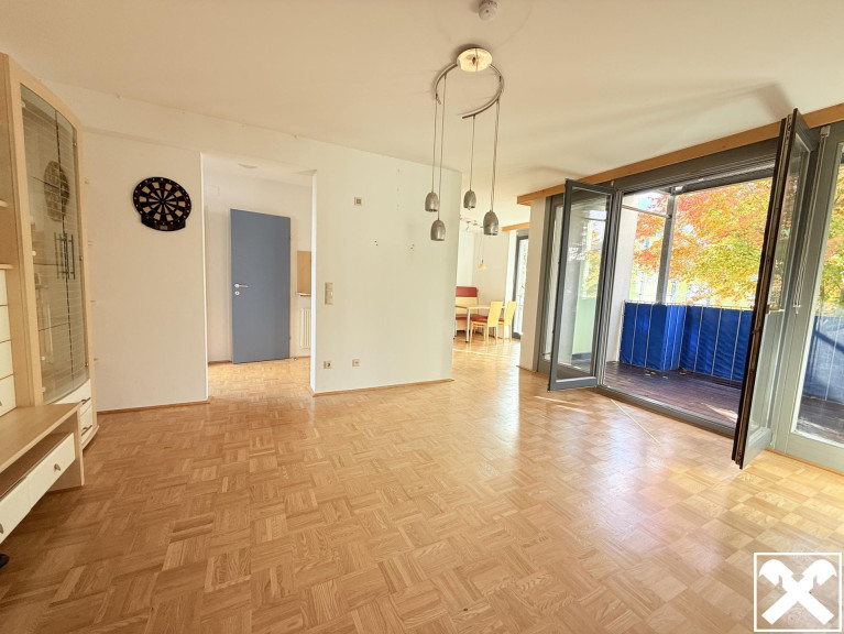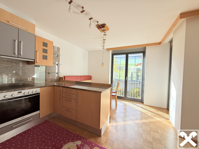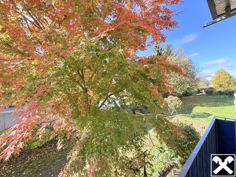 Die Wohnung liegt im 1. Obergeschoß und verfügt über einen Südbalkon/Loggia. Neben dem Vorraum findet man einen Abstellraum und ein WC. Der offen gestaltete zentrale Wohnraum ist mittels Durchgang zur Wohnküche verbunden. Dieser Bereich lässt sich mit geschickter Einrichtungsplanung in ein gemütliches Eigenheim verwandeln. Das Wohnzimmer könnte man auch abtrennen und Wohnen bzw. Essen-Kochen als getrennte Räume gestalten. Die Außenfläche, eine praktische südseitige Loggia, vervollständigt das Platzangebot. Ein wunderschöner Ahornbaum sorgt im Sommer für eine fantastische natürliche Beschattung jetzt, im Herbst sind die bunten Farben ein absoluter Hingucker und machen einfach gute Laune.
