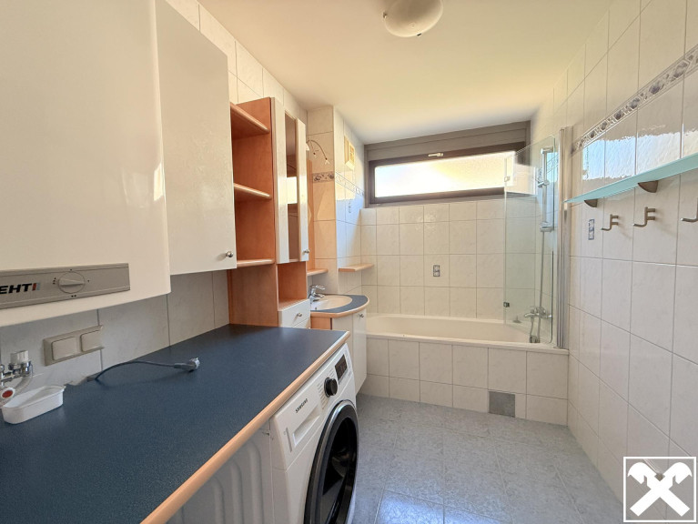 Es stehen ein Elternschlafzimmer und ein Kinderzimmer zur Verfügung, dazwischen befindet sich ein helles freundliches Badezimmer, mit Wanne und Platz für die Waschmaschine. Extra plus bei dieser Wohnung: sowohl das Badezimmer als auch das WC verfügen über ein Fenster!