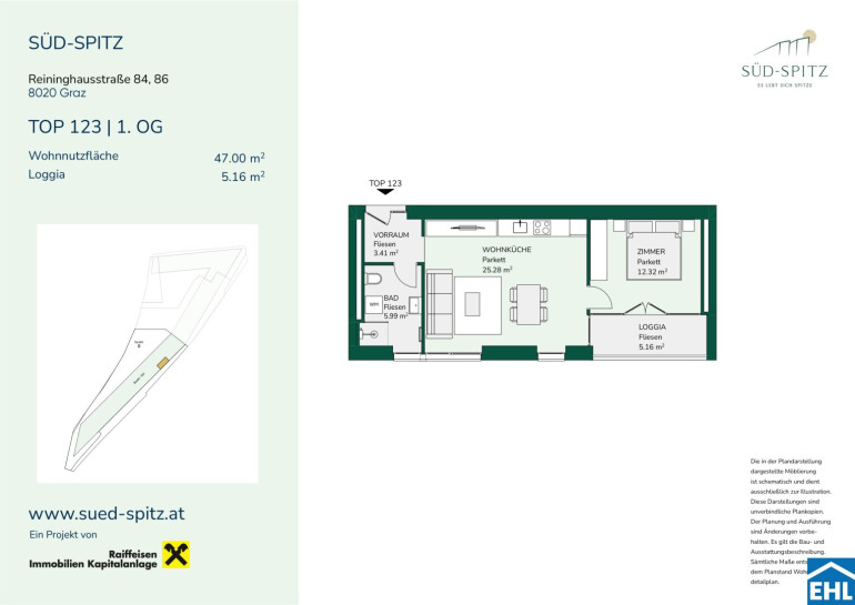 Der Süd-Spitz trägt auch zum Thema Nachhaltigkeit und Energieeffizienz bei, unter anderem durch die PV-Anlage am Objekt sowie auch durch den Fernwärmeanschluss in Kombination einer Sole-Wasser-Wärmepumpe.