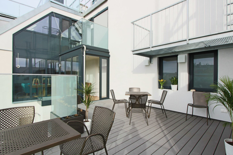 Hinzu kommt der großzügige Co-Living Bereich mit gemütlicher Couch und großem Esstisch, der allen Bewohnern zur Nutzung zur Verfügung steht, sowie einer großen ca. 25m² großen Terrasse.