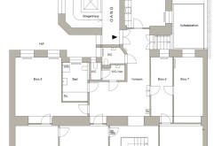 Die Räumlichkeiten im Obergeschoss gliedern sich in 7 Büroräume plus Küche, Bad mit Dusche und WC sowie 2 separate WCs mit Handwaschbecken auf rd. 185m2.