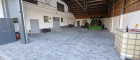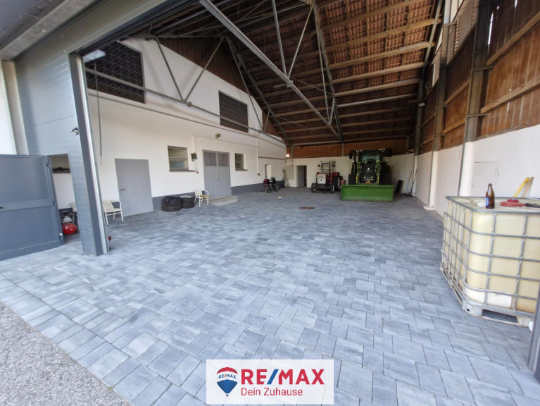Die gesamte Halle hat einen Bodenbelag aus Pflastersteinen und ist mit einem großen Rolltor versperr bar.