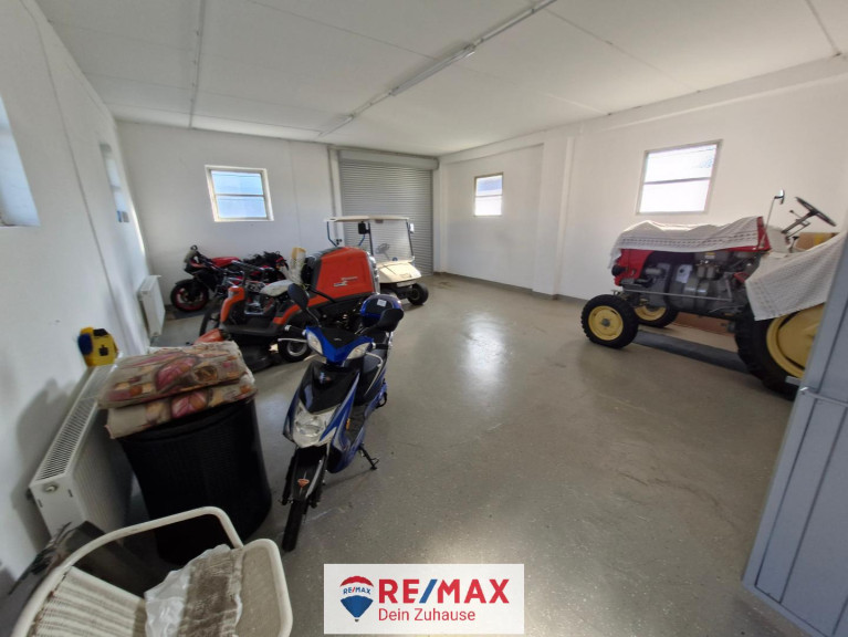 Eingeteilt in eine große Garage mit Rolltor und 3 Lagerräumen.