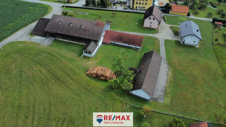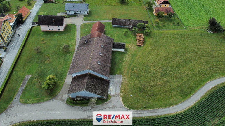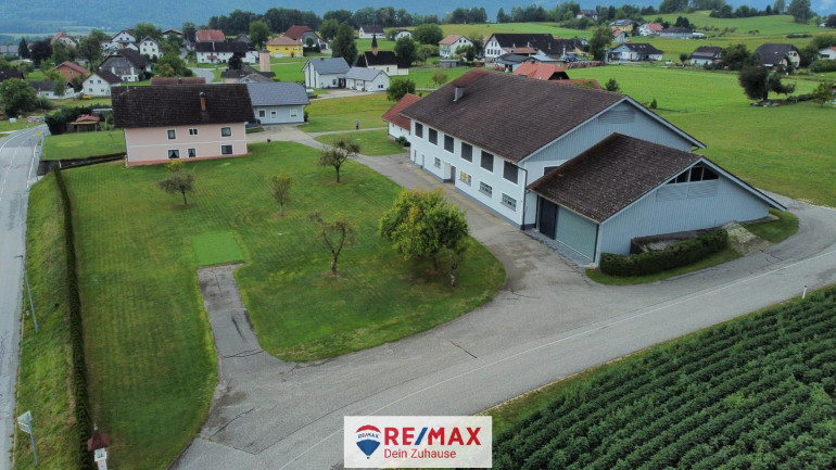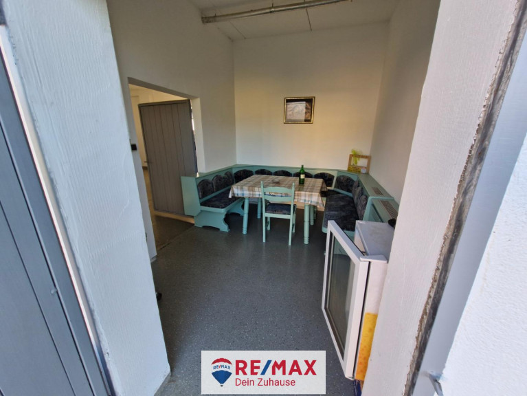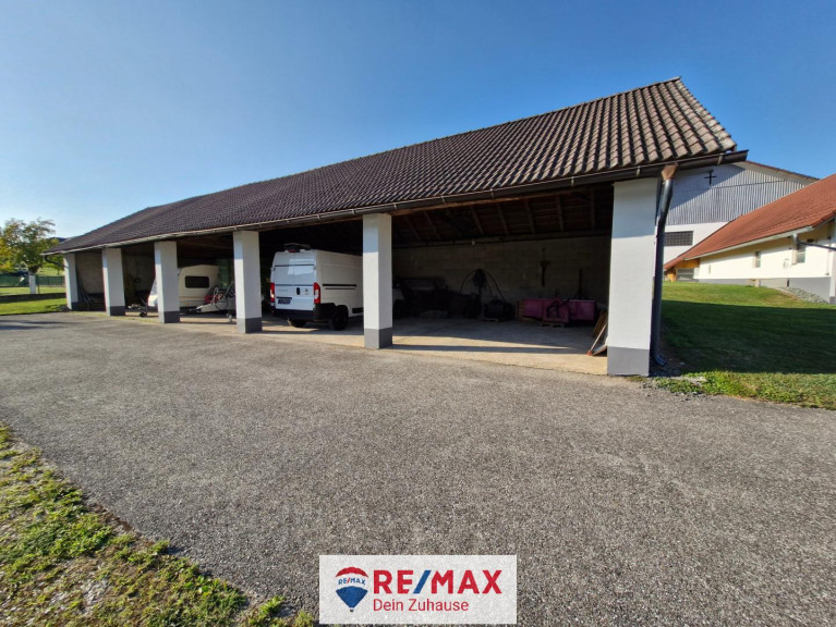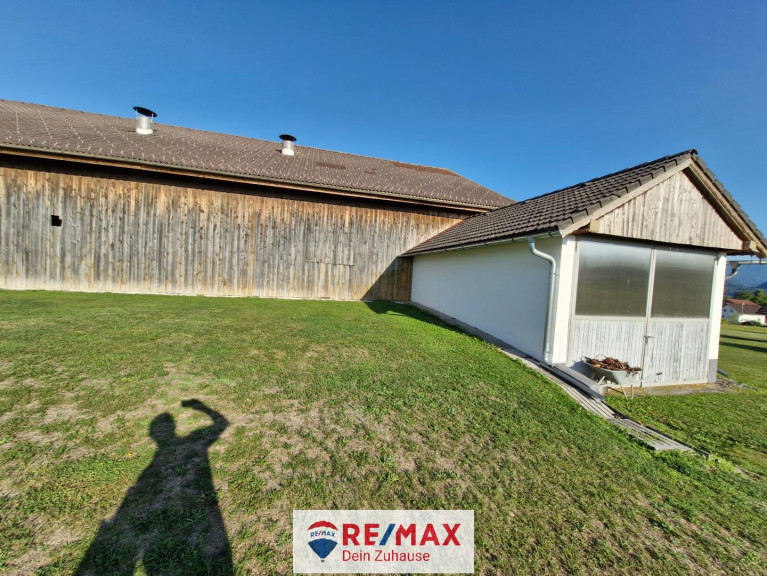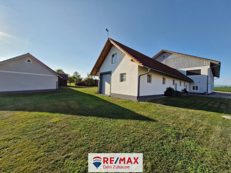 Im niedrigen Anbau am Stall 7 x 20 m befindet sich eine große Garage mit Rolltor und ein Aufenthaltsraum, im Dachraum ist zusätzliches Lager.