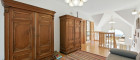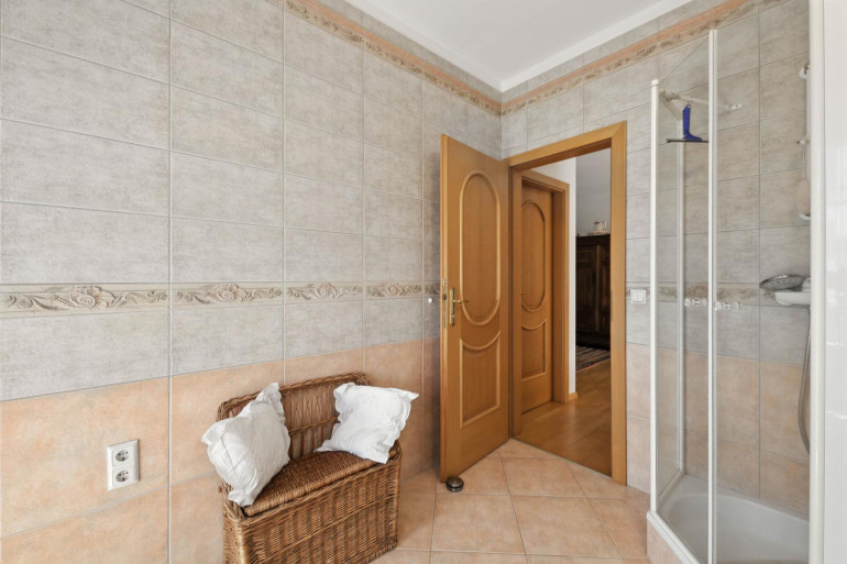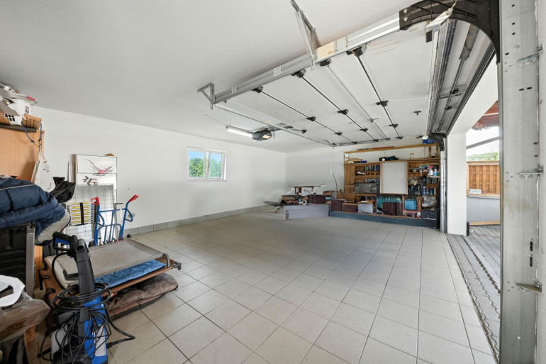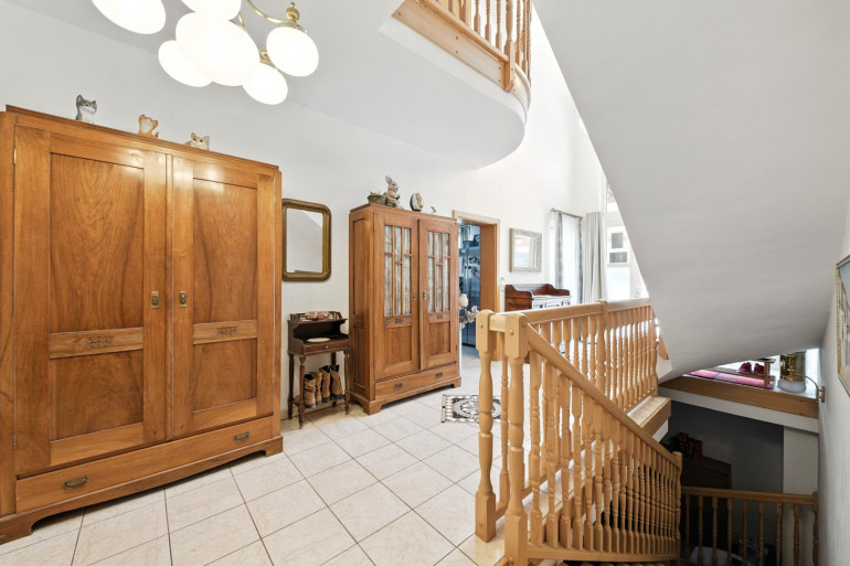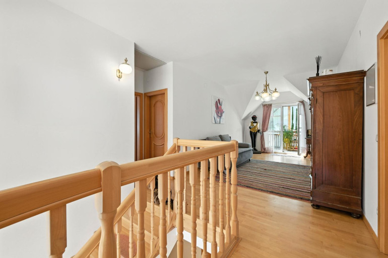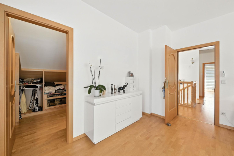 Wenn man den Hauptwohntrakt betritt, wird man augenblicklich von einem ca. 85 m² großen sowie lichtdurchfluteten Wohn- und Essbereich überwältigt. Mit seinem wundervollen Ausblick in den Garten wird der Wintergarten zum Lieblingsplatz. Mit ihrem durchdachten Design und wohnlichen Charme ist die Küche zweifellos eines der zentralen Herzstücke dieses Wohntraums. Ebenfalls in diesem Trakt befindet sich ein Schlafzimmer, eine Gästetoilette und der imposante Eingangsbereich. Über eine angenehme Treppe gelangt man auf die 2. Wohnebene mit einer offenen Galerie, die man als Lese- oder Entspannungsbereich nutzen könnte. Ein Haus mit Galerie schafft Licht, Raum und Freiheiten. Auf dieser Etage befinden sich zwei weitere Schlafzimmer mit Zugang zum Balkon, ein Badezimmer mit Dusche und Badewanne, eine separate Toilette, eine Garderobe sowie ein praktischer Abstellraum. Im Kellergeschoss befinden sich eine gut ausgestattete Waschküche, ein Sanitärbereich/Dusche, eine Toilette, der Technikraum, ein Wirtschaftsraum, ein Fitnessbereich mit angeschlossener Sauna sowie ein Arbeitszimmer – ideal als Home Office nutzbar. Ergänzt wird das Raumangebot durch äußerst großzügige Stauraumflächen. Der Grundriss bietet somit beeindruckende Weitläufigkeit, Familienfreundlichkeit und zugleich ideal gegliederte Privatsphäre.