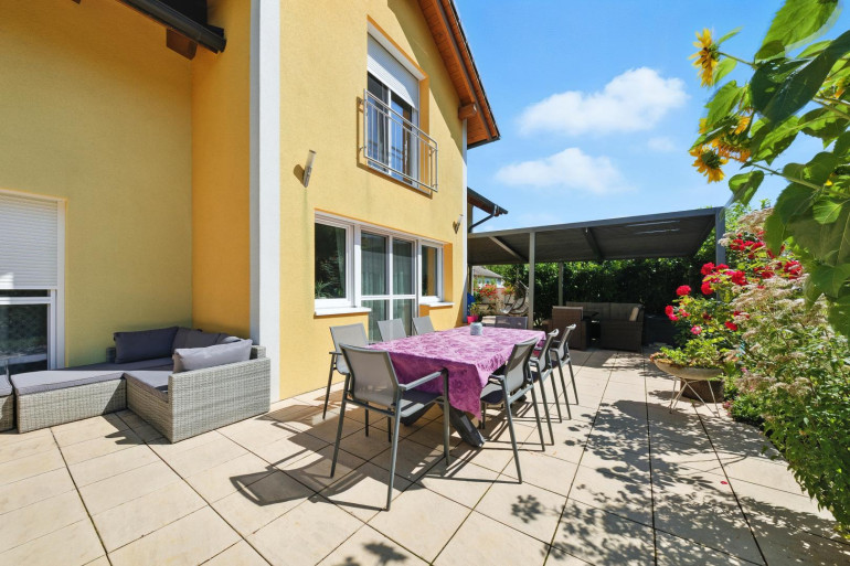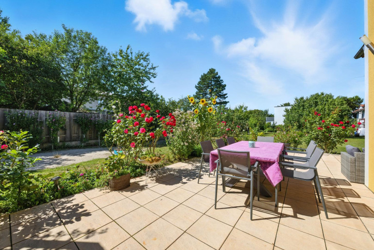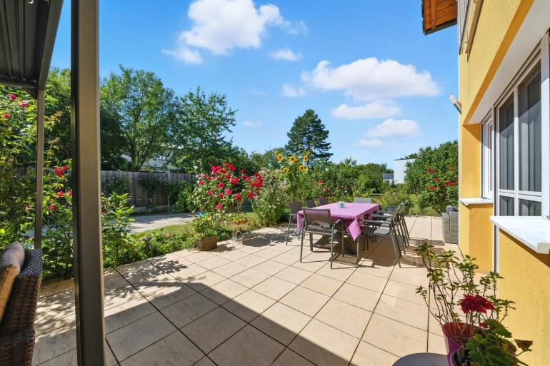 Auch der Außenbereich des Hauses setzt Maßstäbe: Neben dem Haus befindet sich die geräumige Garage mit integriertem Lagerraum und im hinteren Bereich des Gartens befindet sich ein Gerätehaus. Die großzügige Terrasse im Erdgeschoss lädt zu entspannenden Stunden im Freien ein. Zudem bietet der Grillbereich auch den idealen Rahmen für nette Grill-Abende mit Familie und Freunden – ein Genuss für die Sinne in idyllischer Umgebung. Auf der sonnigen Terrasse kann man es sich auch mit einem Glas Wein gemütlich machen und die Ruhe in seinem friedlichen Wohnparadies genießen. Der idyllische Garten bietet Platz für Erholung und Entspannung im Grünen, perfekt für Familien und Naturliebhaber.