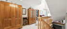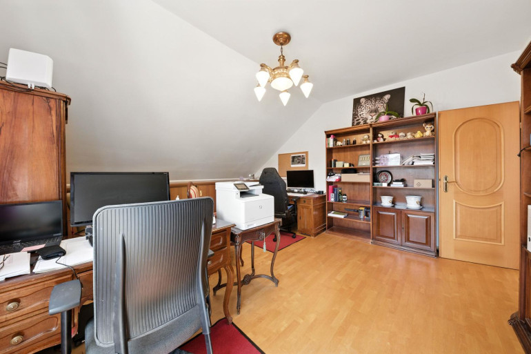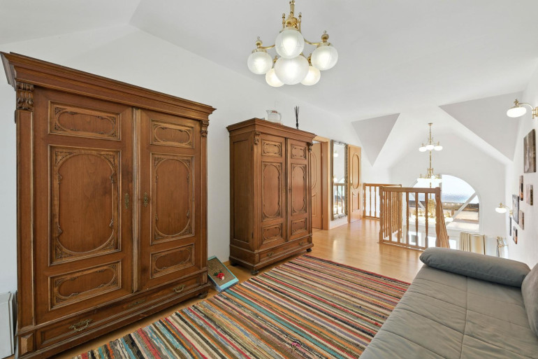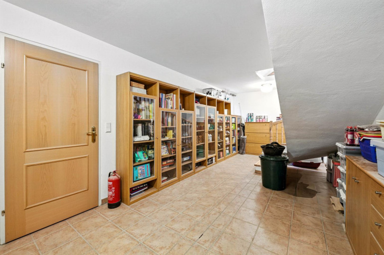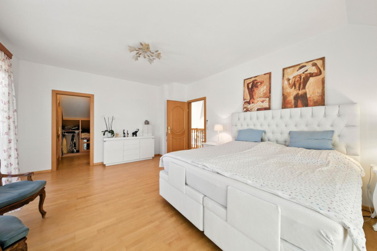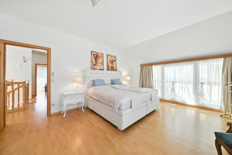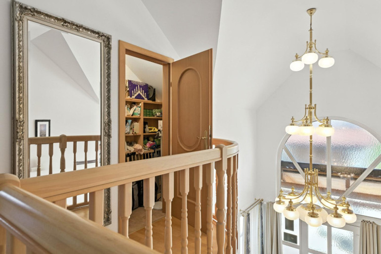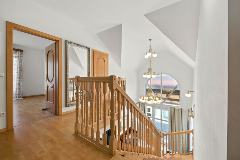 Upon entering the main living area, you are immediately struck by the approximately 85 m² light-filled living and dining area. With its wonderful view of the garden, the conservatory is sure to become your favorite spot. With its thoughtful design and cozy charm, the kitchen is undoubtedly one of the central features of this dream home. This wing also houses a bedroom, a guest toilet, and the impressive entrance area. A pleasant staircase leads to the second floor with an open gallery that could be used as a reading or relaxation area. A house with a gallery creates light, space, and freedom. On this floor, there are two further bedrooms with access to the balcony, a bathroom with a shower and bathtub, a separate toilet, a cloakroom, and a practical storage room. The basement has a well-equipped laundry room, a bathroom/shower, a toilet, a utility room, a fitness area with adjoining sauna, and a study – ideal for use as a home office. The space is complemented by extremely generous storage areas. The floor plan thus offers impressive spaciousness, family friendliness, and at the same time ideally structured privacy.
