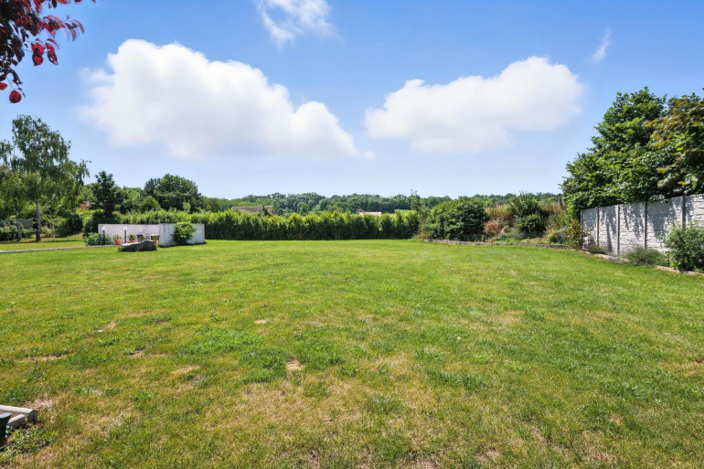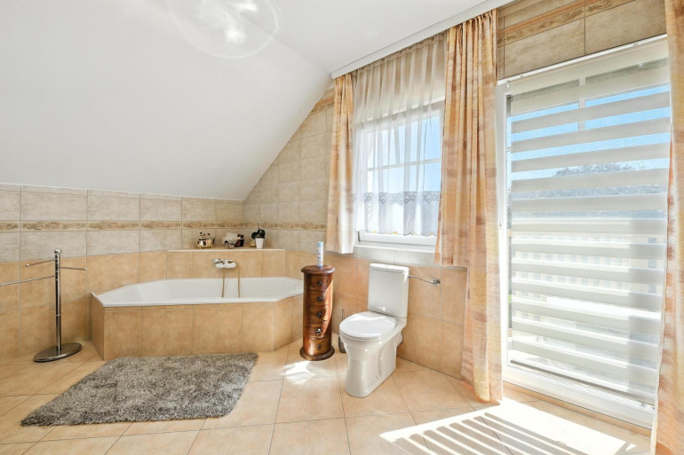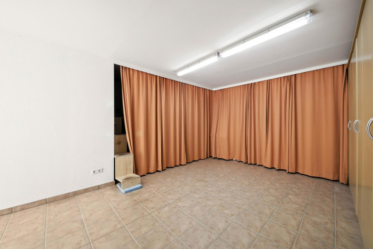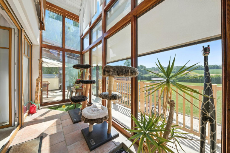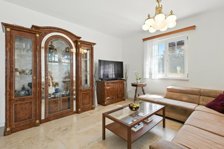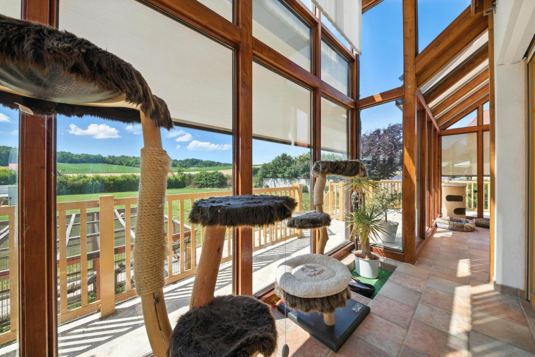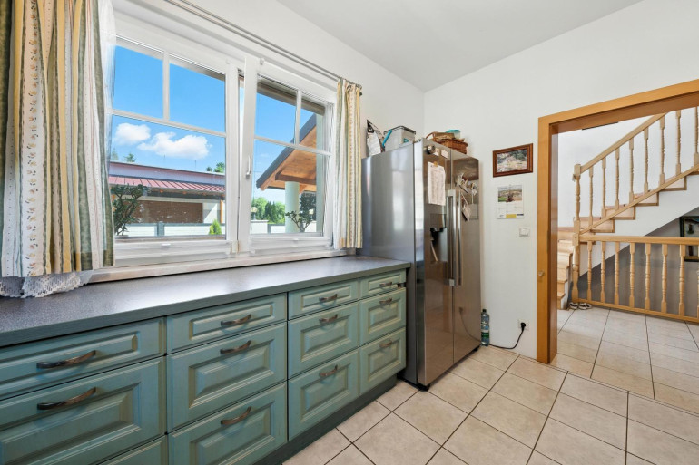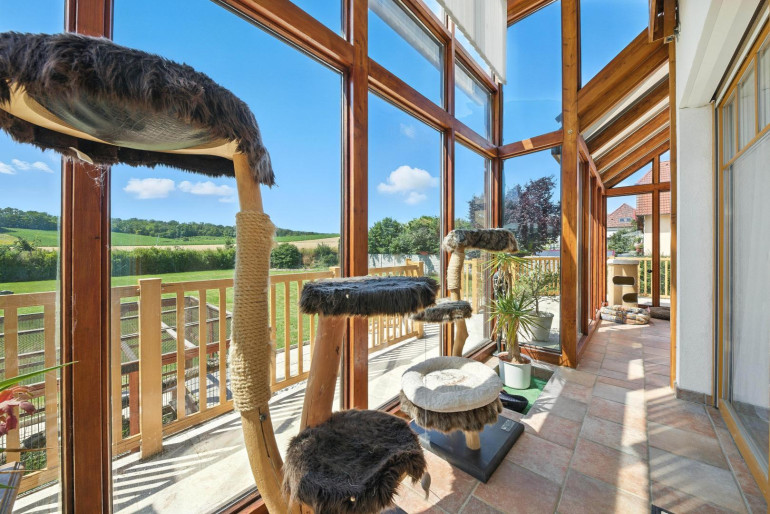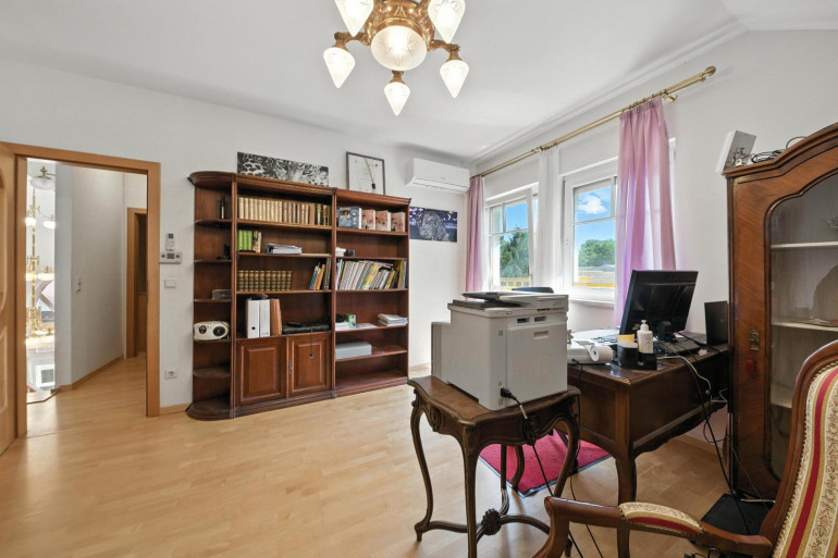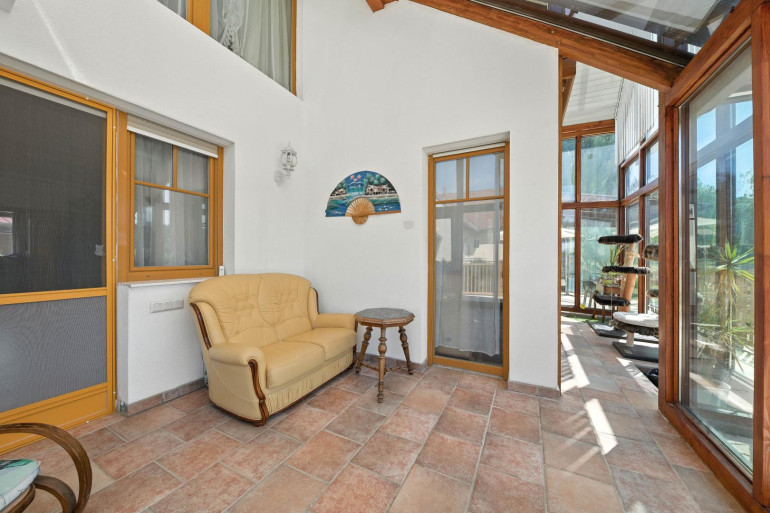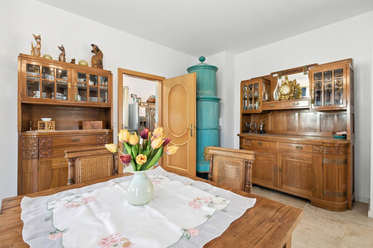 Another absolutely incomparable highlight offered by this unique property is the diverse garden, whose greenery has been lovingly tended and supplemented with numerous new plantings to create an aesthetic ambience. The house is centrally heated by oil-fired underfloor heating, while the tiled stove in the living room provides cozy warmth. All electrical connections and installations are state-of-the-art. Air conditioning units for the conservatory, living room, office, and bedroom complete the technical features inside. In addition, the electric, remote-controlled entrance gate and path lighting complete the technical features in the outdoor area. Another strength of this property is its zoning, as the entire plot is zoned for residential construction.