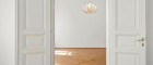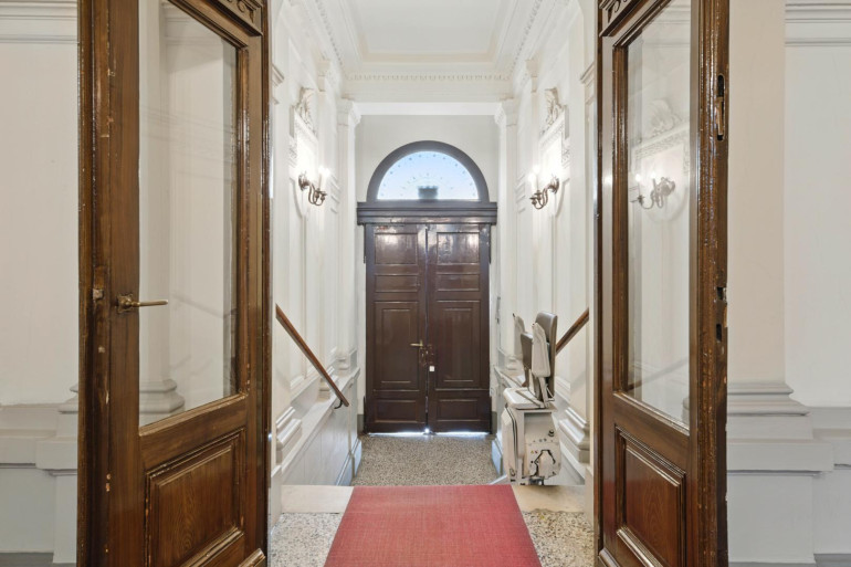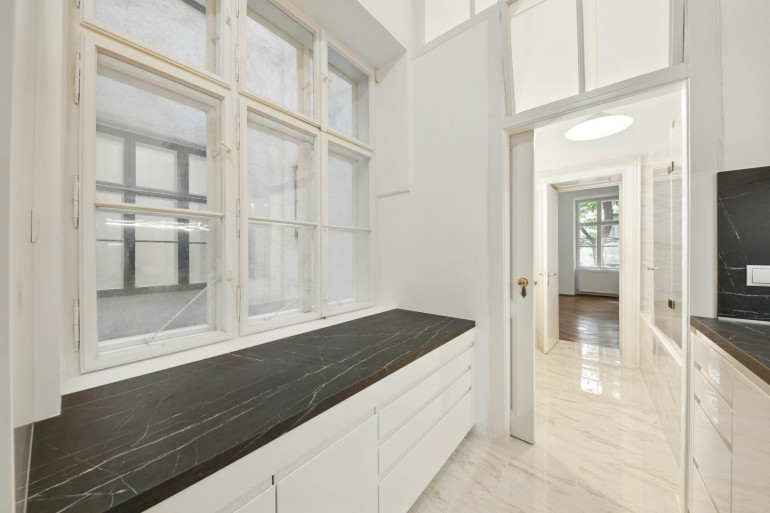 The floor plan is spacious and well thought out: a large, inviting entrance hall forms the center of the apartment and leads to the living room and the adjoining dining room – two stylish rooms with generous double doors, ideal for entertaining or family gatherings. Two quiet rooms facing the courtyard offer a place of retreat with a view of the greenery. A connecting corridor with an atrium leads to the modern, fully equipped kitchen. The bathroom is equipped with a bathtub, washbasin, and washing machine, and the toilet is separate. A basement storage room is also available.