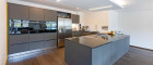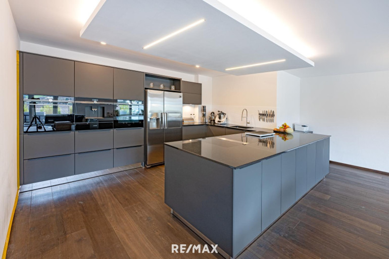 Die Küche beeindruckt mit einer großzügigen U-Form mit dunkler Granitarbeitsfläche und einem 4 Bereich Cerankochfeld. Akzentuiert durch eine indirekte und direkte LED-Beleuchtung. Hochwertige großflächige schwarze Fronten verbergen großzügigen Stauraum und integrieren High-End-Geräte, während durch die großformatigen Fenster einem das Bergpanorama die Alpen direkt ins Küchenambiente gebracht wird.