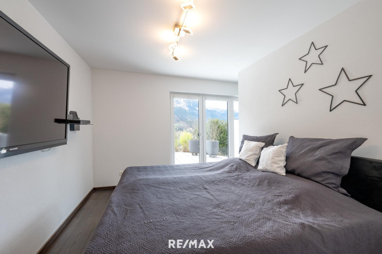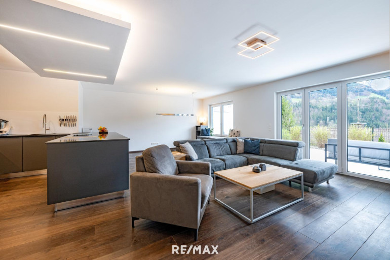 Die Wohnung liegt in einem stilvollen Wohnhaus mit nur wenigen Einheiten, erbaut im Jahr 2018. Die Architektur ist zeitlos, die Bauqualität kompromisslos. Schon der Eingangsbereich vermittelt Großzügigkeit, mit ausreichend Platz für Garderobe und Stauraum. Dahinter öffnet sich ein lichtdurchfluteter Wohn- und Essbereich mit knapp 45 m² – fast 3 Meter Raumhöhe, dreifach verglaste Fenster, ein dunkler hochwertiger Eichenboden in klarer Optik. Und dieser Blick: Der Watzmann & die umliegende Berchtesgadener Berglandschaft in Richtung Königssee wirkt hier nicht wie ein Hintergrund – er wird Teil des Raums.