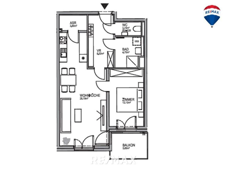 Diese 2-Zimmer-Wohnung im 1. Obergeschoss ist nach Westen zum Innenhof ausgerichtet. Sie verfügt über einen ca. 5,9 m² großen Balkon auf der Innenhofseite. Das Badezimmer ist mit einer Dusche ausgestattet. Eine separate Toilette und ein Abstellraum neben der Küche vervollständigen die gute Raumaufteilung.