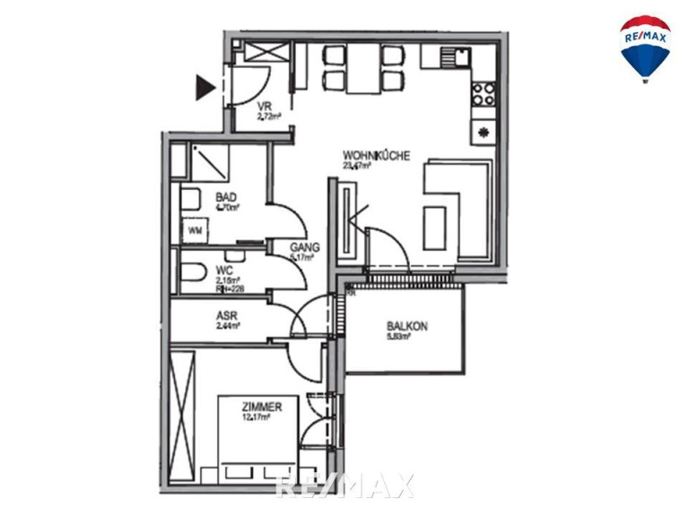 Diese 2-Zimmer-Wohnung im 2. Obergeschoss ist vollständig zur ruhigen Innenhofseite ausgerichtet und verfügt über einen ca. 5,8 m² großen Balkon. Das Badezimmer ist mit einer Dusche ausgestattet. Eine separate Toilette und ein Abstellraum vervollständigen die gute Raumaufteilung.