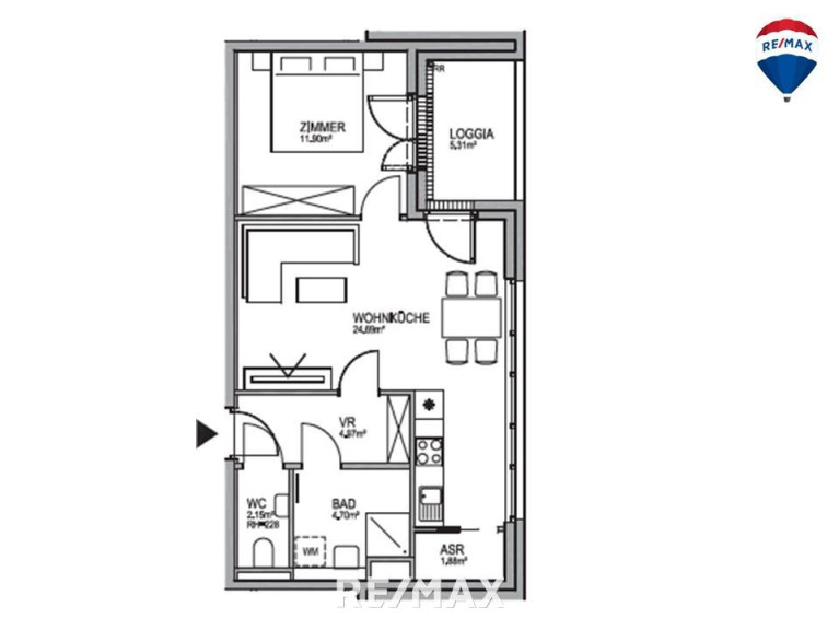Diese 2-Zimmer-Wohnung im 1. Obergeschoss ist nach Süden ausgerichtet. Sie verfügt über eine ca. 5,3 m² große südliche Loggia Richtung Anastasius-Grün-Gasse. Das Badezimmer ist mit einer Dusche ausgestattet. Eine separate Toilette und ein Abstellraum vervollständigen die gute Raumaufteilung.