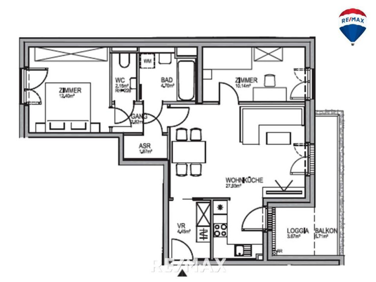 Diese 3-Zimmer-Wohnung im 2. Obergeschoss ist nach Süden und nach Norden ausgerichtet. Sie verfügt neben der Wohnküche über eine ca. 3,7 m² große südliche Loggia und ca. 5,7 m² Balkon zur Anastasius-Grün-Gasse. Das Badezimmer ist mit einer Badewanne ausgestattet. Eine separate Toilette und ein Abstellraum vervollständigen die gute Raumaufteilung.