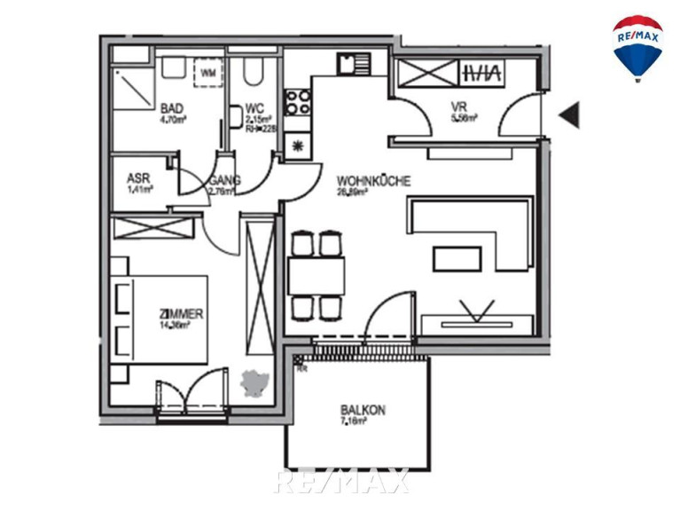 Diese 2-Zimmer-Wohnung im 3. Obergeschoss ist nach Westen zum Innenhof ausgerichtet. Sie verfügt über einen ca. 7,2 m² großen Balkon neben der Wohnküche. Das Badezimmer ist mit einer Dusche ausgestattet. Eine separate Toilette und ein Abstellraum vervollständigen die gute Raumaufteilung.