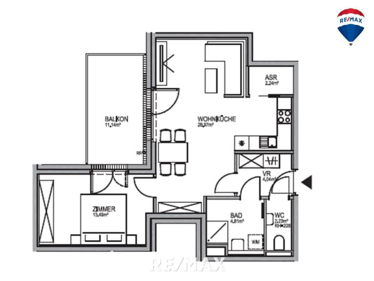 Diese 2-Zimmer-Wohnung im 3. Obergeschoss ist nach Nordosten zum Innenhof ausgerichtet. Sie verfügt über einen ca. 11,1 m² großen Balkon neben der Wohnküche und dem Schlafzimmer. Das Badezimmer ist mit einer Dusche ausgestattet. Eine separate Toilette und ein Abstellraum neben der Küche vervollständigen die gute Raumaufteilung.