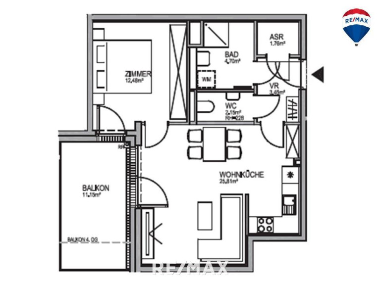 Diese 2-Zimmer-Wohnung im 3. Obergeschoss ist nach Norden zum Innenhof ausgerichtet. Sie verfügt über einen ca. 11,1 m² großen Balkon auf der Nordwestseite neben der Wohnküche. Das Badezimmer ist mit einer Dusche ausgestattet. Eine separate Toilette und ein Abstellraum vervollständigen die gute Raumaufteilung.