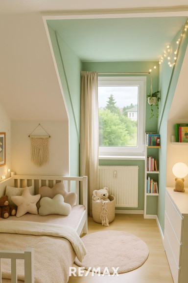 Eine gefällige Holztreppe führt in das Dachgeschoss mit zwei Schlafzimmer mit Gaupenfenster, einem Bad und einem Vorraum.