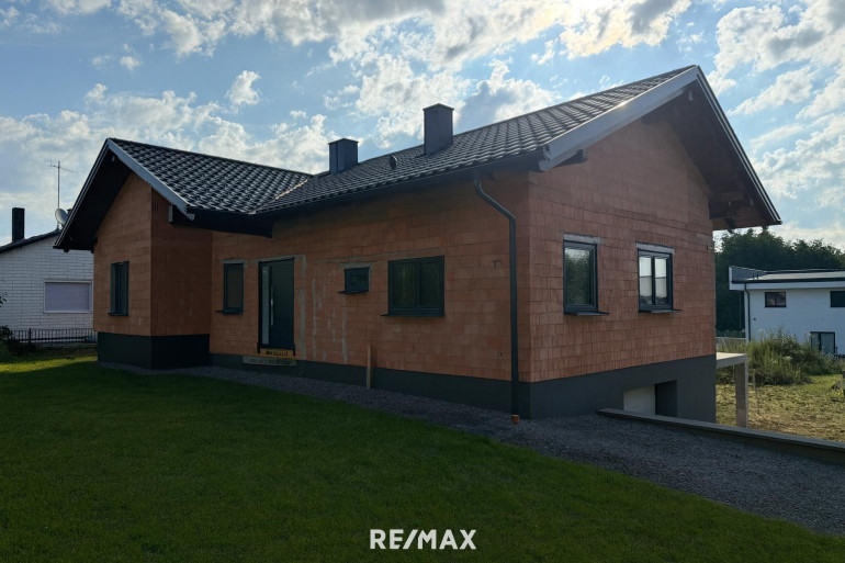 Modern geplanter Bungalow mit einer Wohnnutzfläche von ca. 128 m², einem Kellergeschoss von ca. 100 m² auf einem 1372 m² großen Grundstück. Die Immobilie befindet sich in einer ruhigen Siedlungslage in Südostausrichtung, als eines von mehreren Häusern einer Wohnsiedlung nahe Unterbruck in der Marktgemeinde Prambachkirchen.