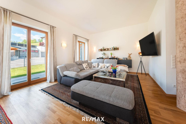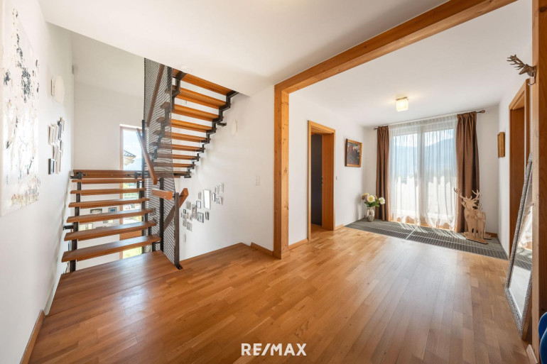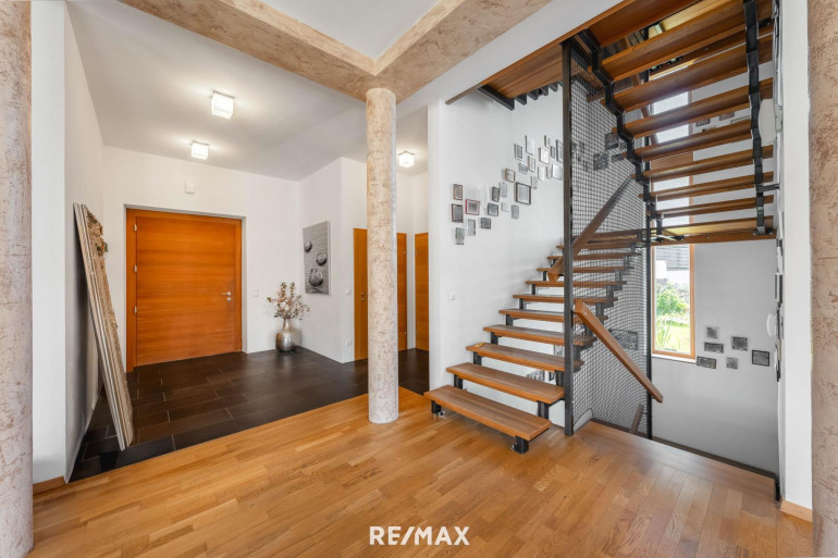 Im Erdgeschoß erwartet Sie ein offener Wohn- und Eingangsbereich mit beeindruckender Raumhöhe von 3,20 Metern. Die Kombination aus natürlichem Licht, stilvollem Interieur und harmonischem Design schafft ein einladendes Wohngefühl. Ergänzt wird das Erdgeschoß durch ein elegantes Badezimmer sowie ein separates WC – ideal für den Alltag und Besuch.