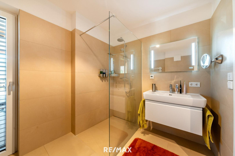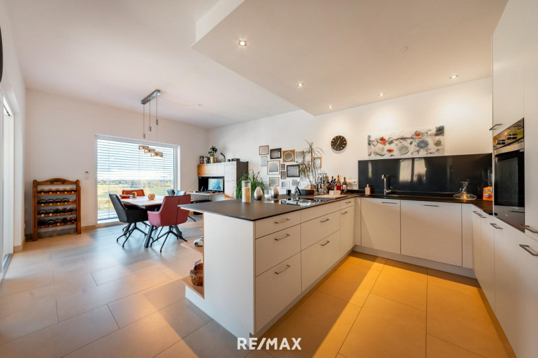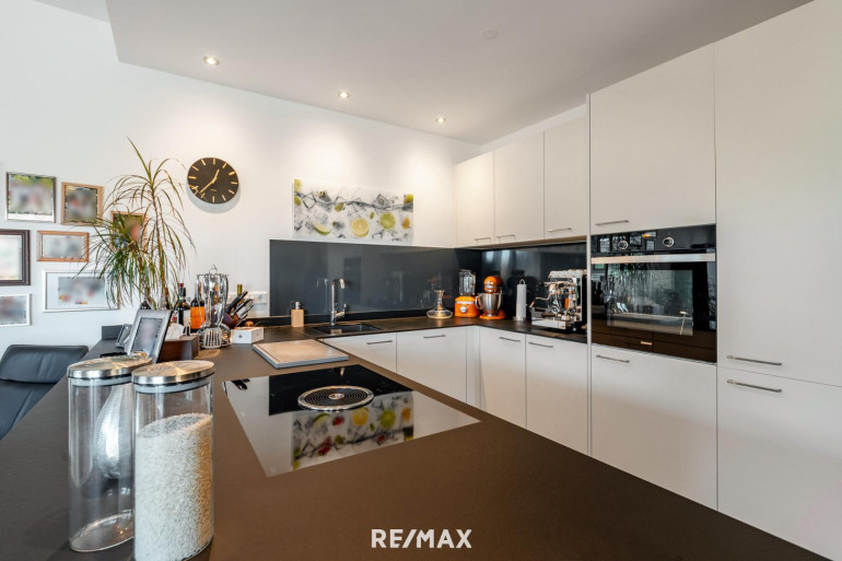 Effiziente Energieleistungen, ein funktional durchdachter Grundriss, sowie moderne hochwertige Ausstattung samt Küche mit großer Kochinsel und Steinplatten runden das Angebot dieser exklusiven Wohnung ab. Zur Ausstattung gehören hochwertige Naturstein- und Eichenparkettböden sowie elektrische Außenjalousien.