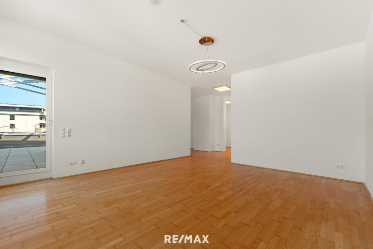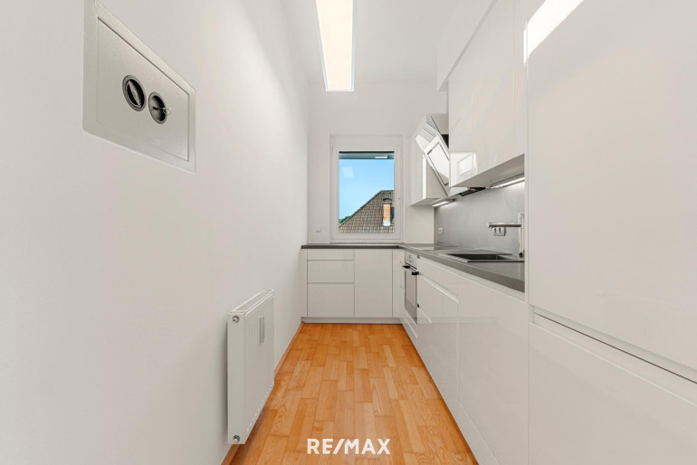 Besonders hervorzuheben ist der großzügige Wohn-/Essbereich, der durch große Fensterflächen eine lichtdurchflutete Atmosphäre schafft und direkt auf die ca. 29 m² große Dachterrasse führt – der perfekte Ort zum Entspannen und Genießen mit herrlichem Ausblick. Die moderne DAN-Küche mit hochwertigen Einbaugeräten fügt sich harmonisch in das offene Raumkonzept ein.
