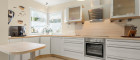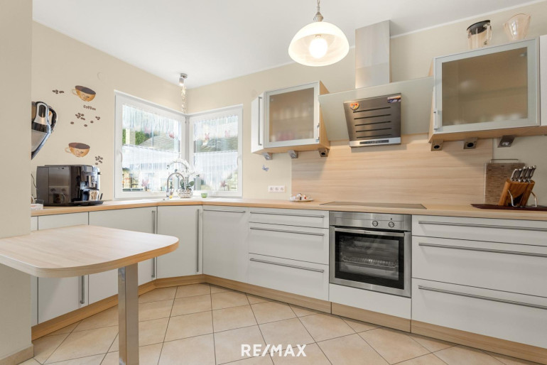 Der offene Koch-/Wohn-/Essbereich bietet durch großzügige Fensterfronten ein lichtdurchflutetes Ambiente und der stilvolle Specksteinofen schafft eine behagliche Wohnatmosphäre sowie wohlige Wärme. Die moderne, hochwertige Küche ist perfekt ausgestattet und fügt sich harmonisch in das Wohnkonzept ein.