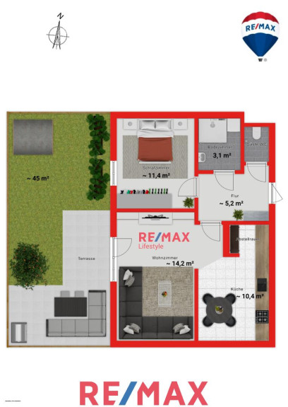 Ein besonderes Highlight ist der ca. 40 m² große, westseitig ausgerichtete Eigengarten mit Terrasse, der zusätzlichen Wohnkomfort bietet und zum Entspannen im Freien einlädt.