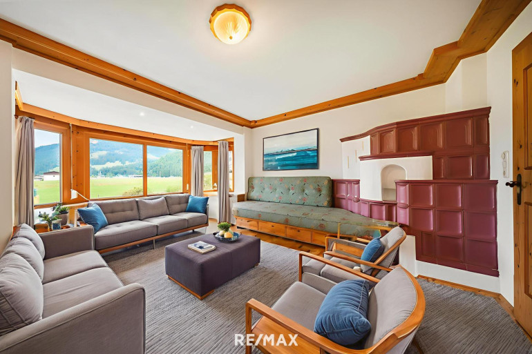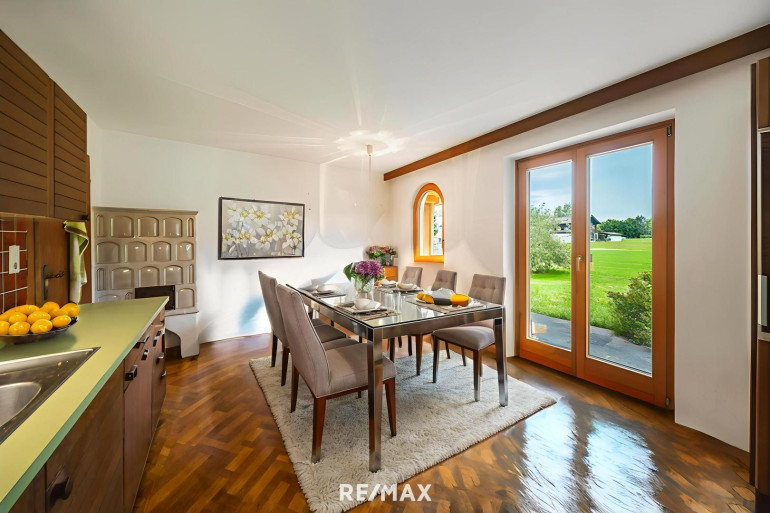 - Erdgeschoss mit Küche, Essbereich, großem Wohnraum mit Kachelofen, Bad und Schlafzimmer