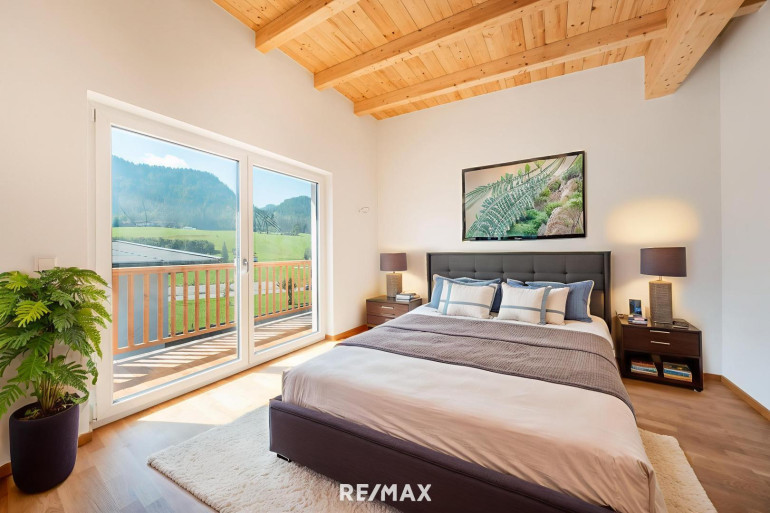 • Größeres Schlafzimmer mit Balkonblick auf die Bergwelt
