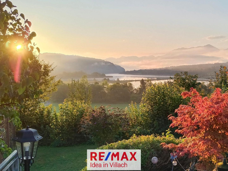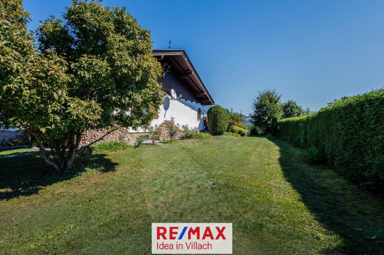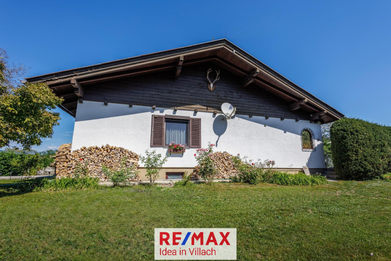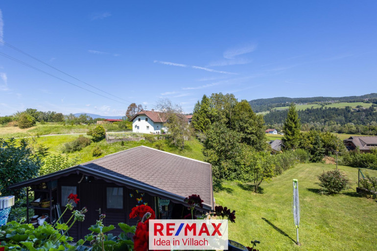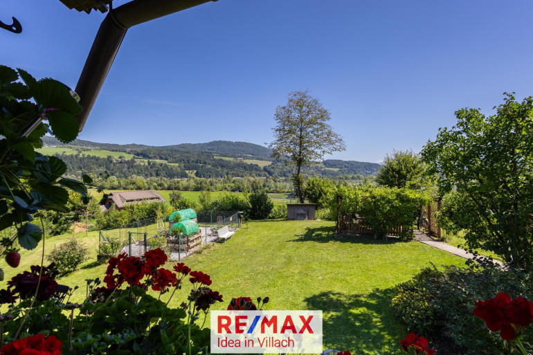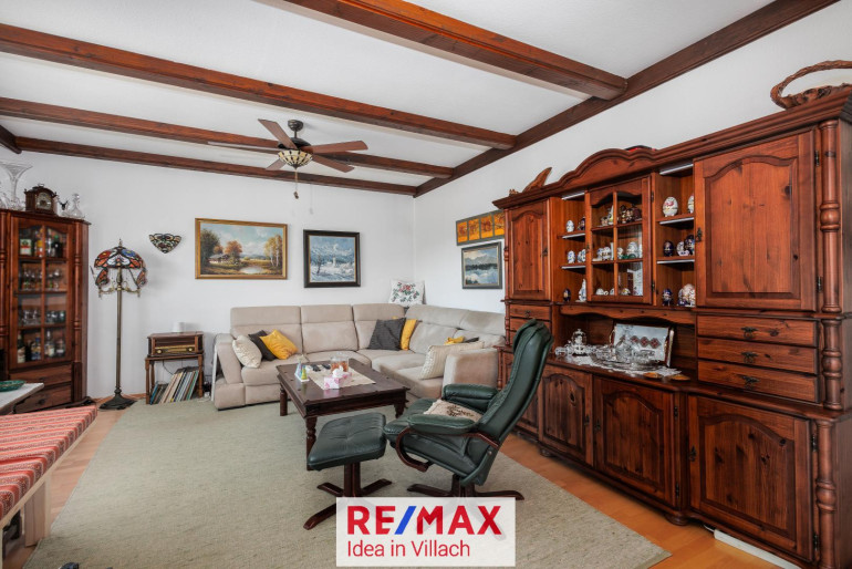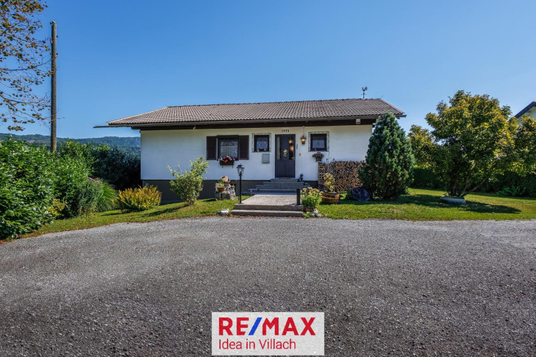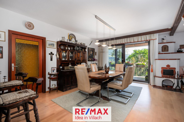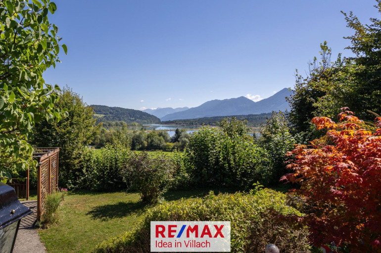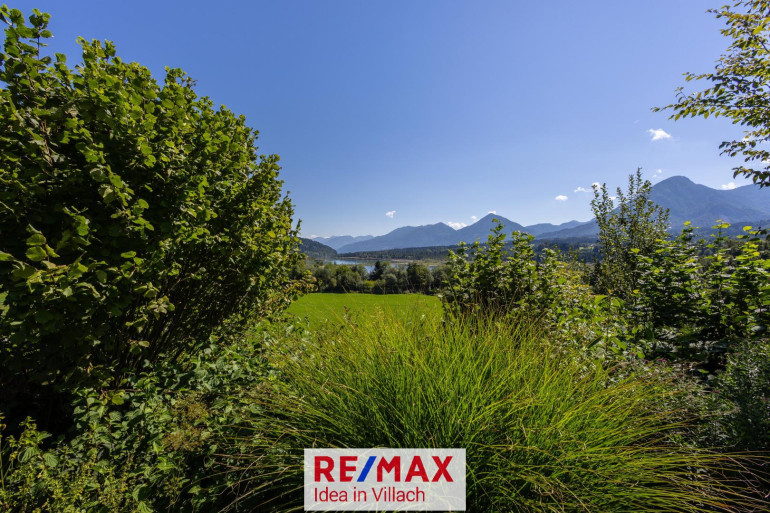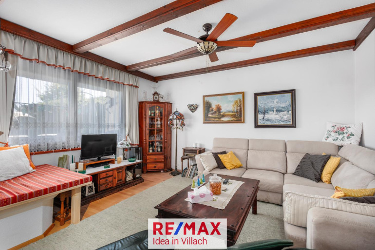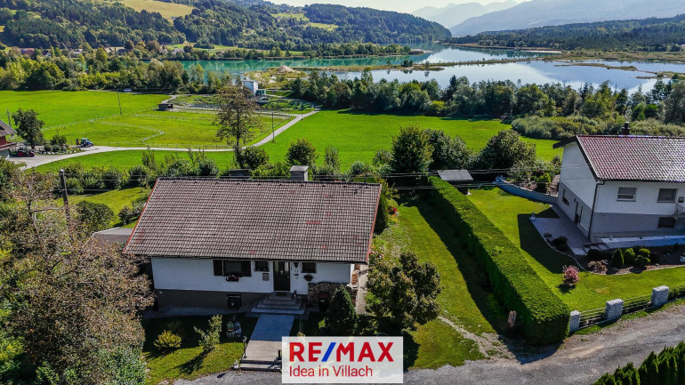 Dieser Bungalow mit rund 2.900 m² Garten bietet viel Platz für Familie, Hobbys und Erholung. Vom Wohnzimmer aus gelangen Sie direkt auf die Terrasse und den Balkon – mit wunderschönem Blick über die Drau.