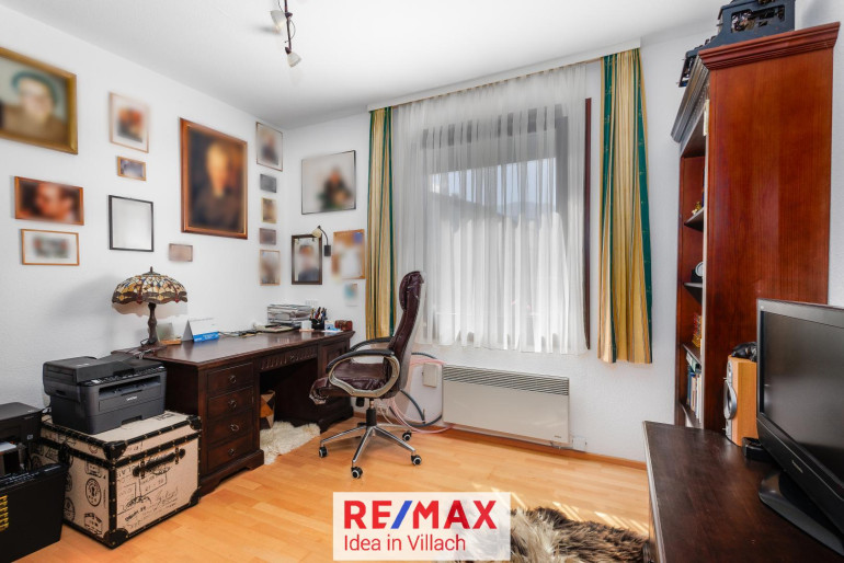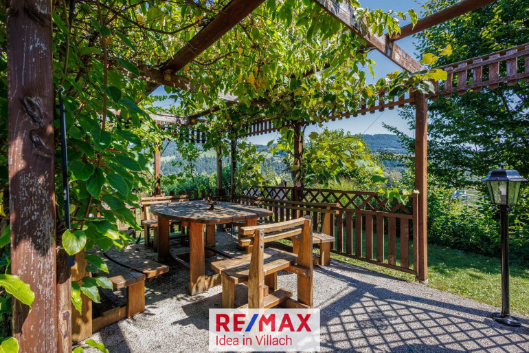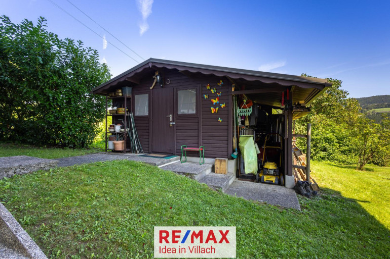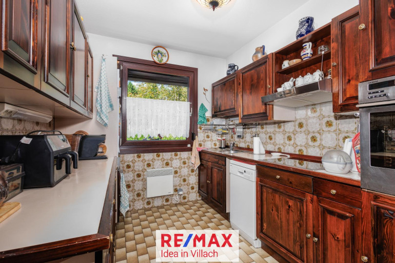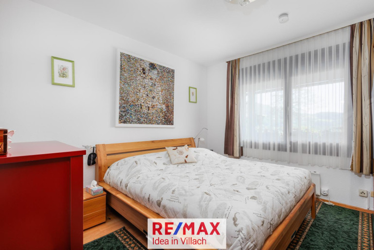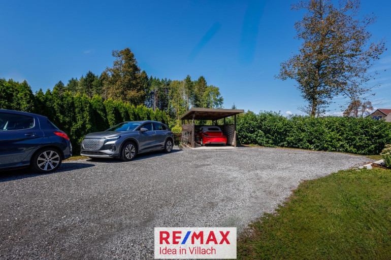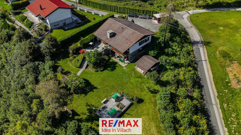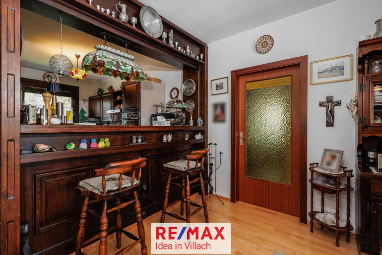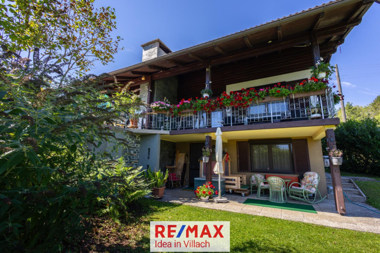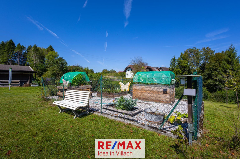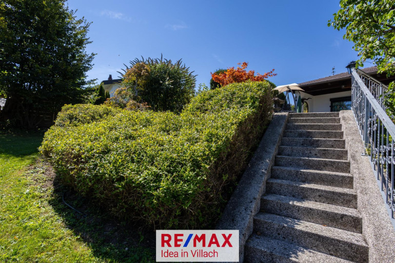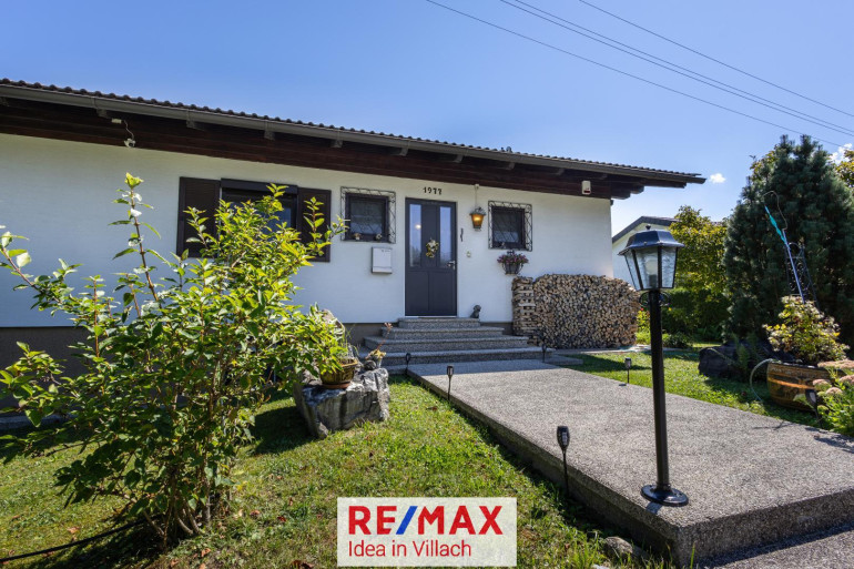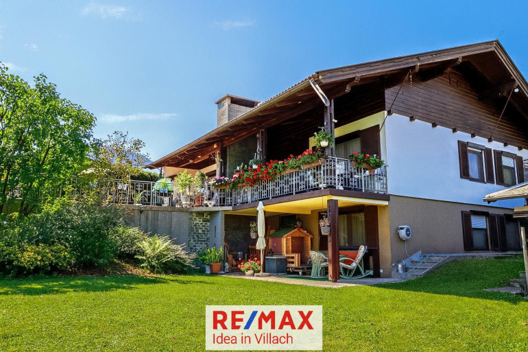 Dieser Bungalow mit rund 2.900 m² Garten bietet viel Platz für Familie, Hobbys und Erholung. Vom Wohnzimmer aus gelangen Sie direkt auf die Terrasse und den Balkon – mit wunderschönem Blick über die Drau.