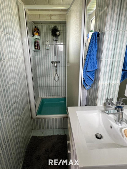 Von der Garage gelangt man über die großzügige Veranda ins Haus. Das Erdgeschoss verfügt über ein helles und geräumiges Wohnzimmer, ein Schlafzimmer, eine Küche mit Essbereich, ein Badezimmer mit Badewanne und ein weiteres Badezimmer mit Dusche.