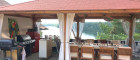 Der Boden aus Naturstein, ein großer Esstisch unter freiem Himmel, darüber eine solide Überdachung, die Schatten spendet – oder Schutz, wenn das Sommergewitter vorbeizieht. Drum herum blühende Pflanzen, das Rascheln der Bäume, das Rufen eines Vogels aus dem angrenzenden Wald.