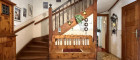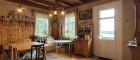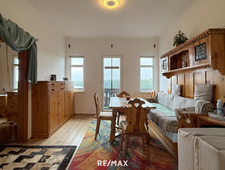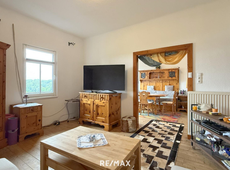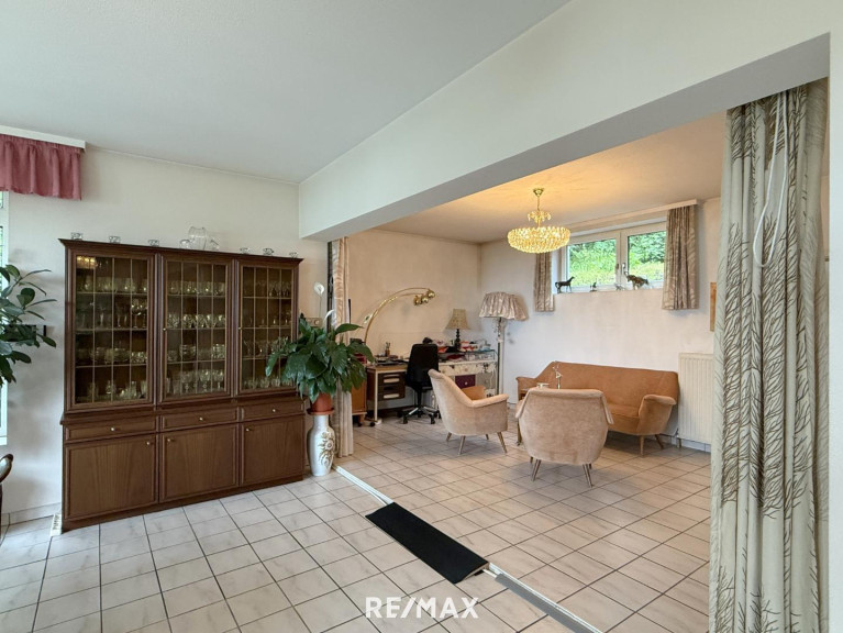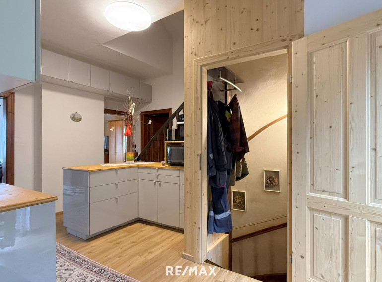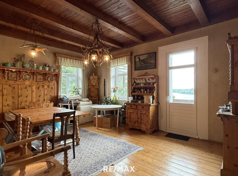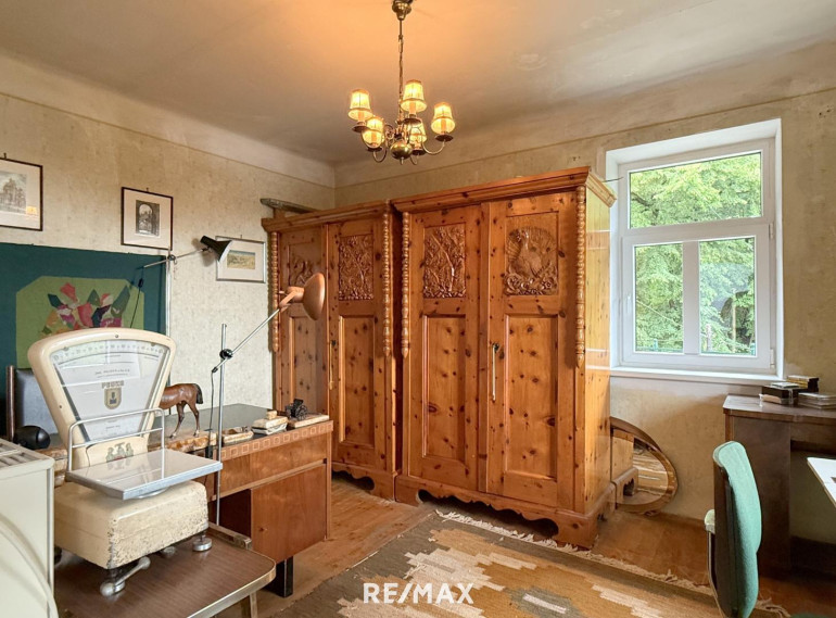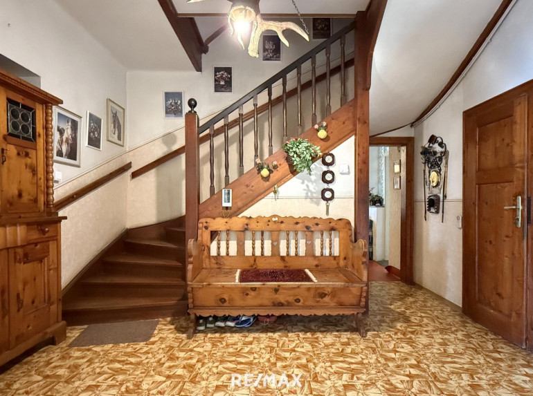 Die ursprüngliche Bauphase reicht zurück bis 1930, mit einem charmanten Altbestand, der heute noch rund 176 m² Wohnfläche auf zwei Ebenen bietet. Die Räume sind liebevoll altmodisch, verwinkelt, heimelig. Holz dominiert. Man spürt das Alter des Hauses – aber im besten Sinn. Es hat Charakter, Haltung, Tiefe. Und wer auf diesen Dielen geht, hört die Geschichten früherer Zeiten.