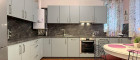 Zartgraue Fronten, eine schwarze Granitarbeitsplatte, alles noch fast neu, mit einem Hauch von Eleganz. Hier duftet es nach Abendessen und Alltag, nach „Wie war’s in der Schule?“ und „Hilfst du mir beim Schneiden?“. Während die Kinder am Tisch ihre Hausaufgaben machen, klappert das Schneidebrett, und irgendwo läuft das Radio.