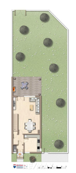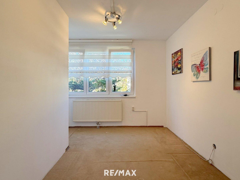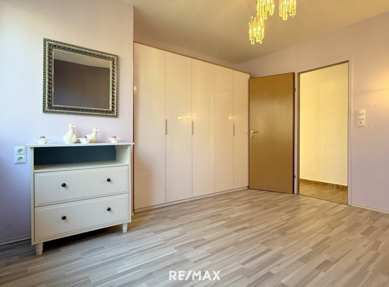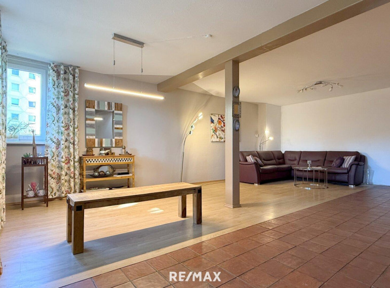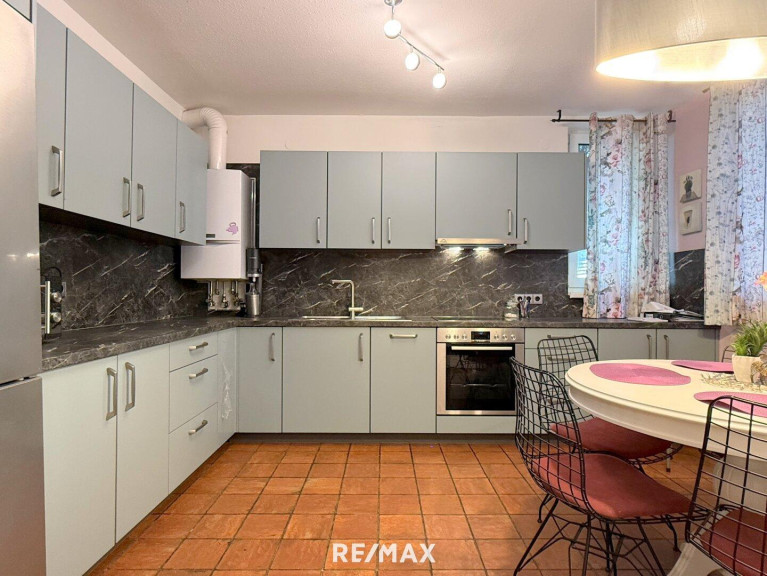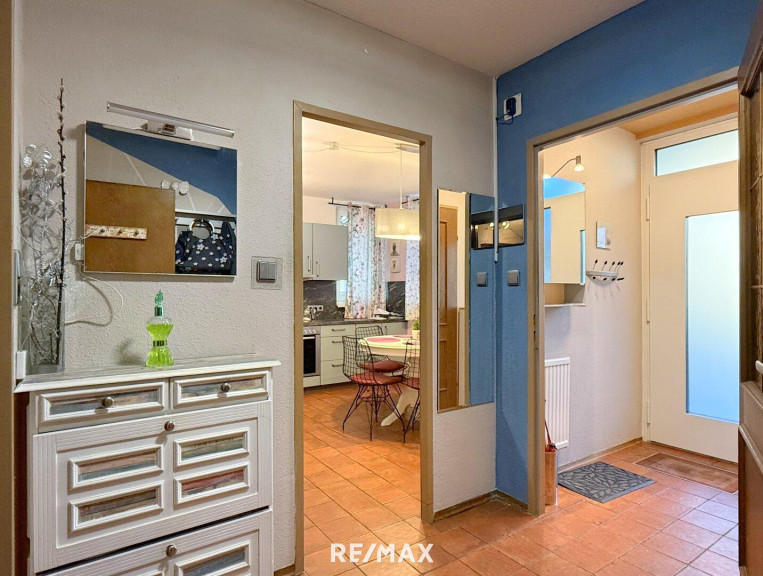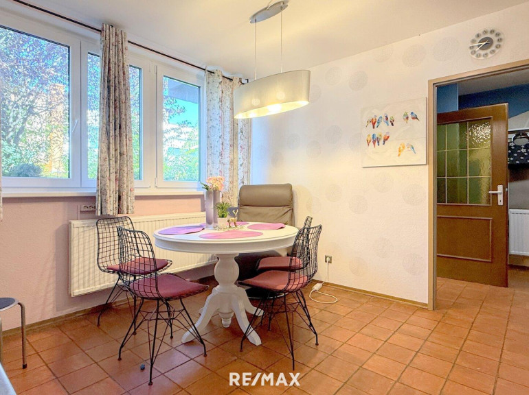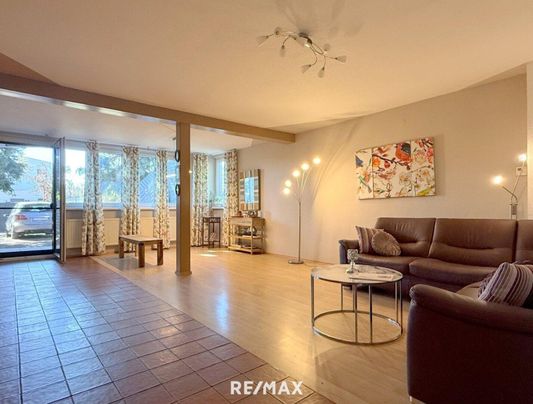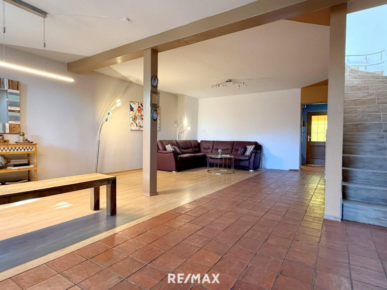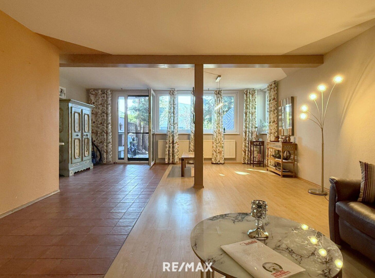 Geradeaus öffnet sich der Wohn- und Essbereich, großzügig und Blick in den Garten. Hier lässt sich alles gut zonieren: der Esstisch beim Fenster, die Couch weiter hinten, der Fernseher genau richtig platziert. Die Terrassentür führt hinaus auf eine gepflasterte Terrasse von ca. 24 m², ideal für Frühstück in der frischen Luft oder entspannte Grillabende.