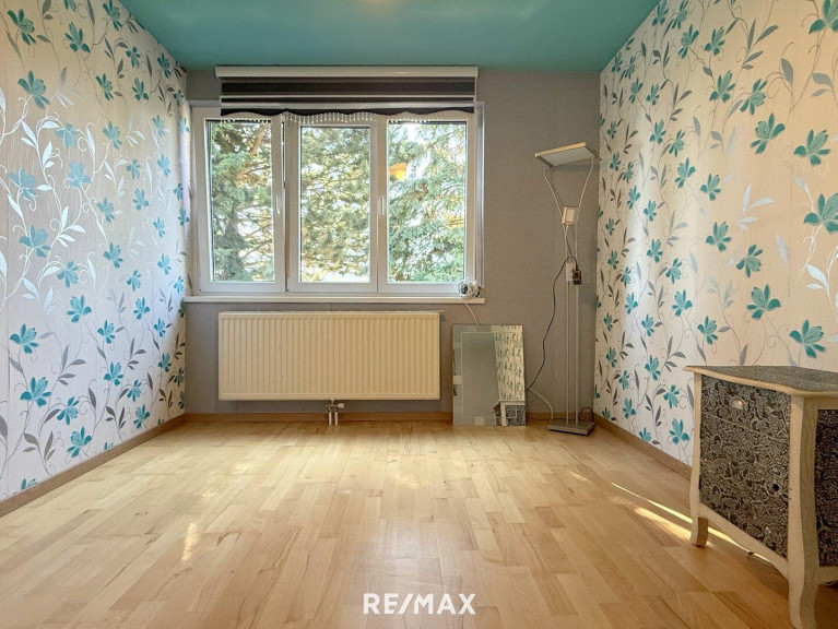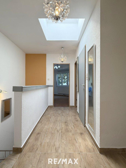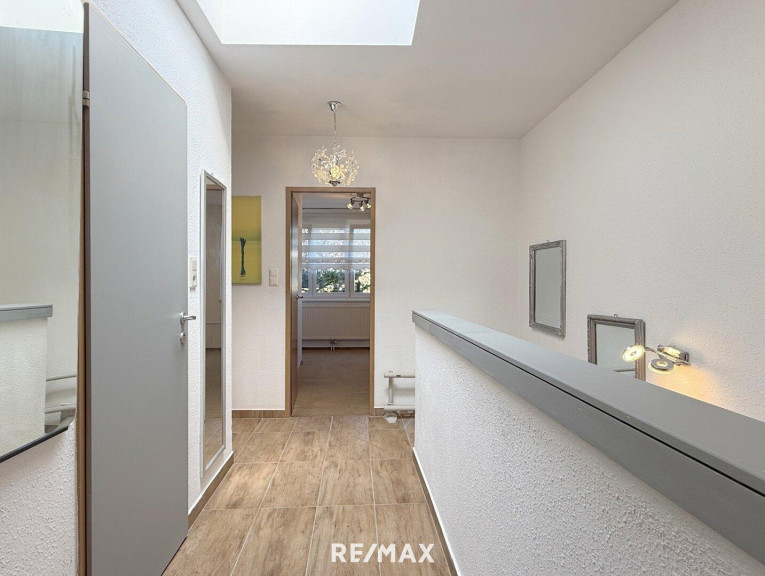 Über die Treppe ins Obergeschoss gelangt man in eine helle Etage mit vier individuell geschnittenen Zimmern – jedes mit eigenem Charakter, zwei Richtung Garten, zwei Richtung Straße. Hier lassen sich Kinderzimmer, Arbeitszimmer oder Rückzugsorte nach Belieben gestalten. Große Fenster lassen viel Tageslicht herein und eröffnen von fast allen Räumen den Blick ins Grün, während die Lichtkuppel im Stiegenhaus zusätzlich für ein freundliches, sonnendurchflutetes Ambiente sorgt.