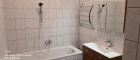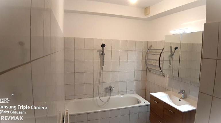 Das moderne Badezimmer überzeugt mit Größe: Badewanne, Spiegelschrank und Waschmaschinenanschluss sind vorhanden. Das WC ist funktional in das Bad integriert, aber klar abgetrennt.