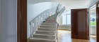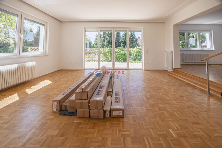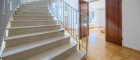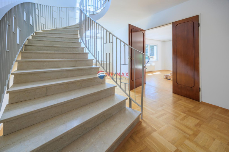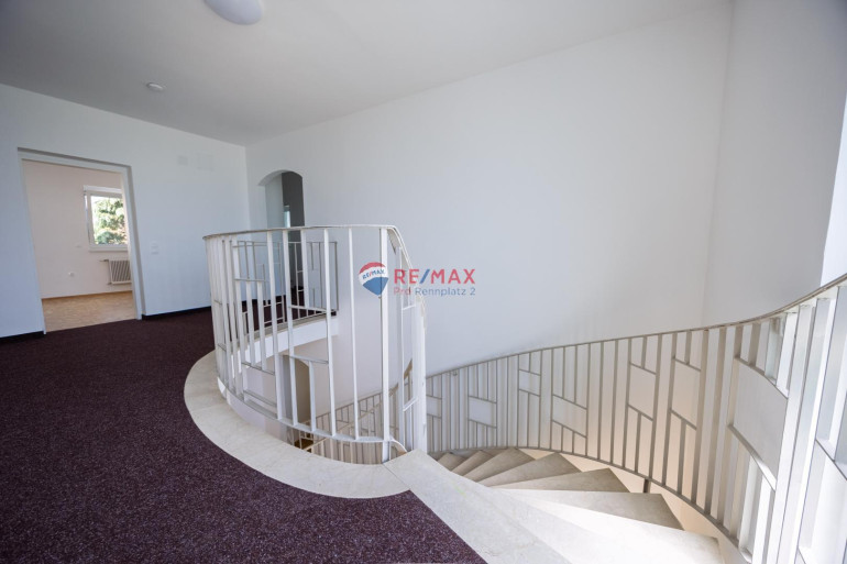 Bereits im Erdgeschoss empfängt Sie ein repräsentativer Eingangsbereich mit einer eleganten, geschwungenen Treppe ins Obergeschoss. Im Erdgeschoss finden Sie ausreichend Platz für Wohnen und Arbeiten unter einem Dach – ideal für Selbstständige oder als Büronutzung.
