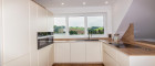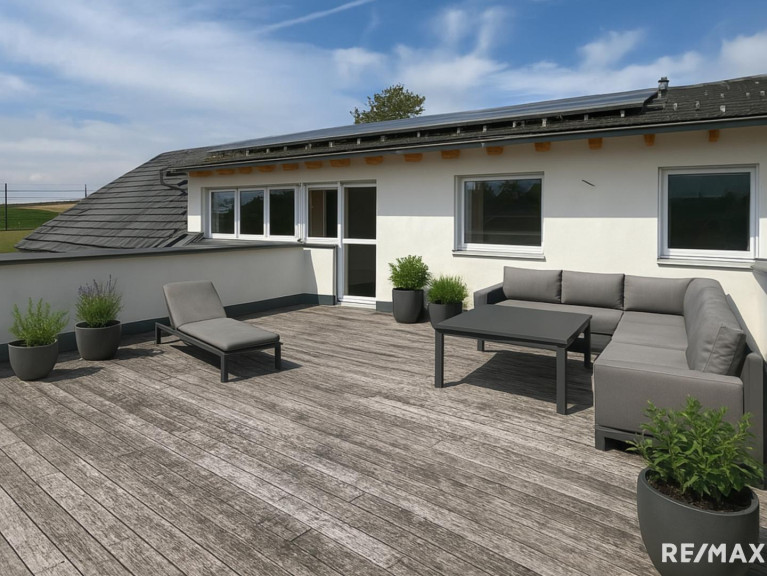 Im Obergeschoss überzeugt eine weitere Wohneinheit mit einem ausgeklügelten Grundriss, offenem Wohn-Essbereich samt moderner Küche, herrlichem Balkon mit Fernblick sowie einer weitläufigen Dachterrasse – konzipiert für entspannte Stunden unter freiem Himmel und bewährt für einen Whirlpool.