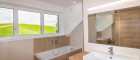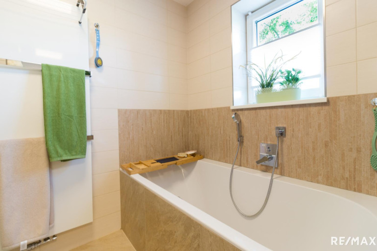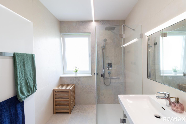 Die Bäder sind stilvoll und hochwertig ausgeführt – mit geschmackvollen Fliesen, eleganter Ausstattung, Badewanne und bodengleicher Dusche. Hier trifft Ästhetik auf Komfort.