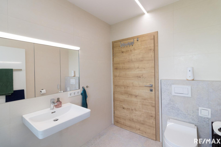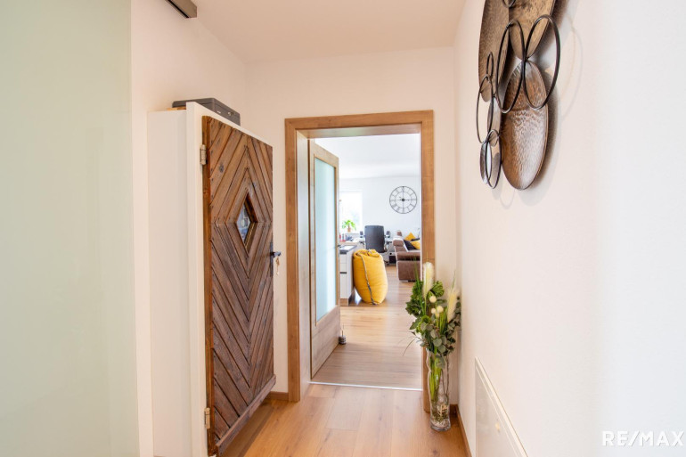 Im Erdgeschoss befindet sich eine großzügige Hauptwohnung mit hochwertiger Küche, stilvoll integrierten Wohnbereichen sowie direktem Zugang zur angrenzenden Einliegerwohnung – ideal für Gäste, Familienmitglieder oder auch zur Vermietung.