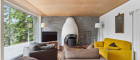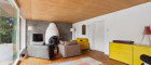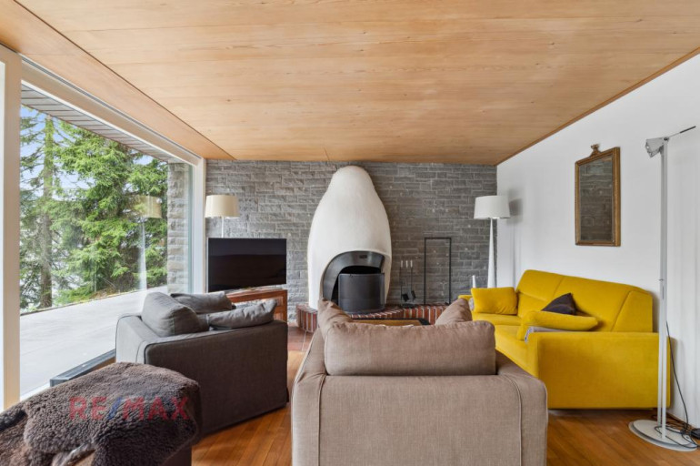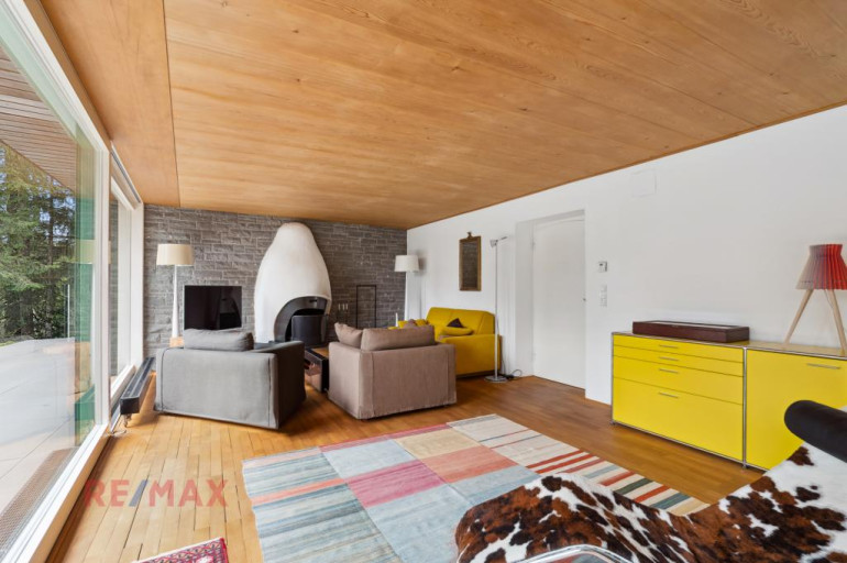 Das exklusive Wohnzimmer mit offenem Kaminofen bildet das Herzstück des Hauses, mit Blick ins Grüne und Zugang zur Terrasse. Ein Ort zum Ankommen, Entspannen und Wohlfühlen.