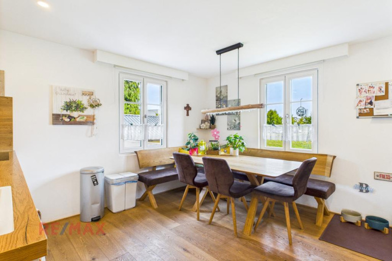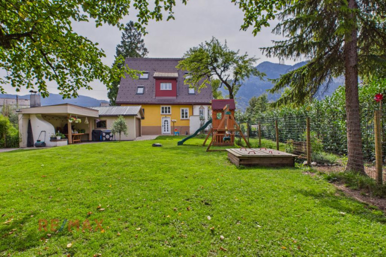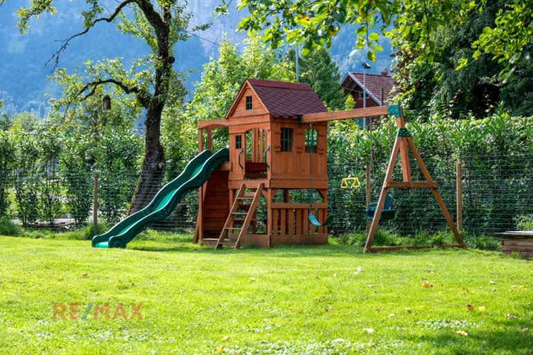 Draußen lädt ein großer Garten zum Entspannen ein – mit Boccia-Bahn, gemütlichem Sitzplatz und Kamin für gesellige Abende. Die massive Holzkonstruktion des Giebels unterstreicht die solide Bauweise. Das gute Wohngebiet Dornbirn-Hatlerdorf überzeugt mit ruhiger Lage und fußläufig erreichbarem ÖPNV – ideal für Familien und Berufstätige.