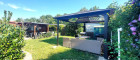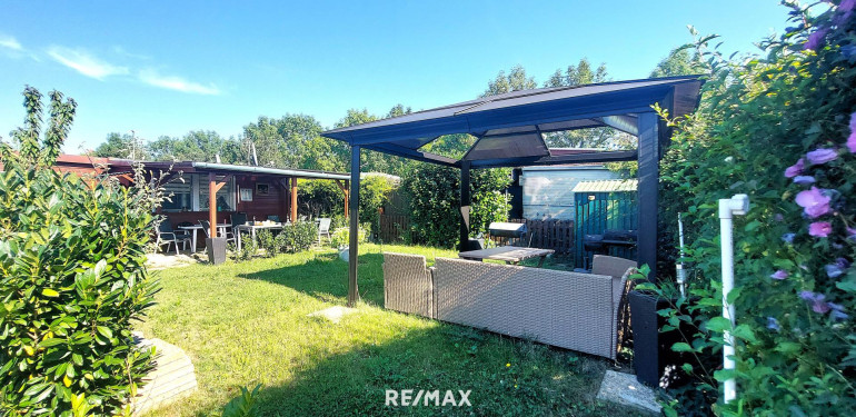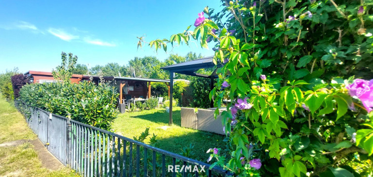 Das Wohnmobil mit einer Wohnfläche von ca. 34m² verfügt über ein Wohn-Esszimmer mit einer Küchenzeile, einem Wohn- Schlafzimmer, einem Badezimmer mit Dusche und WC sowie einem Abstellraum. Eine ca.15m² große überdachte Terrasse sorgt für einen angenehmen Aufenthalt im Freien. Im Garten gibt es einen Pavillon und einen Geräteschuppen. Das Mobilheim steht auf einer Doppelparzelle mit ca 185 m². Dazu besteht die Parkmöglichkeit auf der Parzelle.