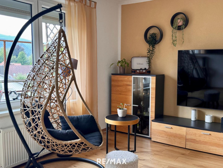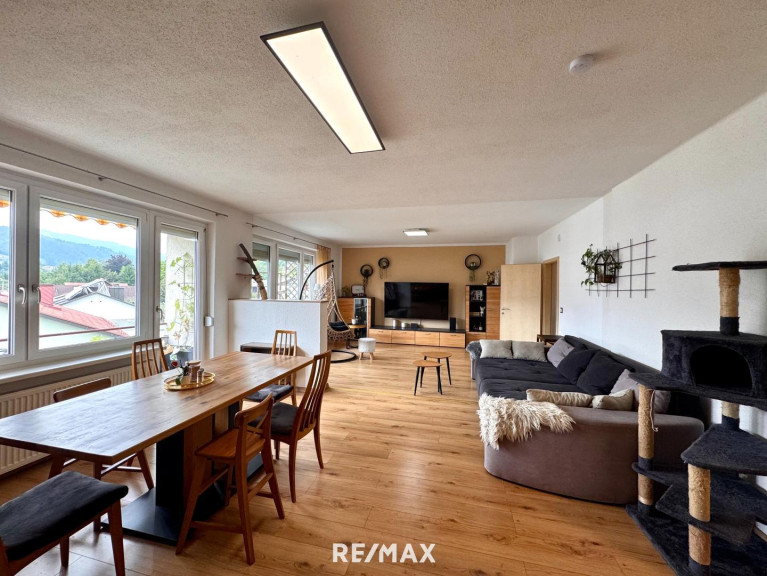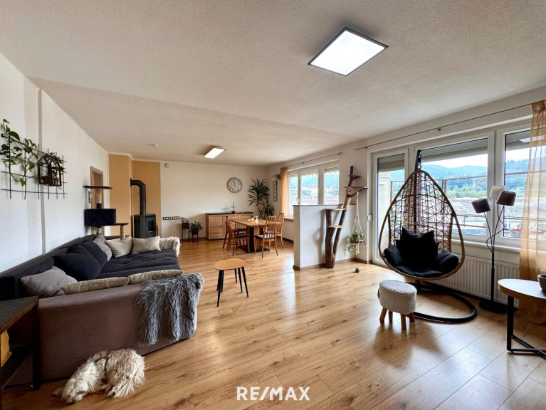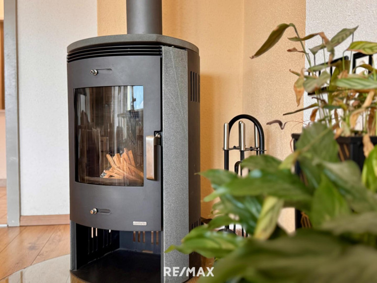 Das große Wohn- und Esszimmer mit zwei Balkone bildet das Herzstück der Wohnung. Hier trifft man sich zum Spielen, Essen und Entspannen. Der Schwedenofen sorgt nicht nur für angenehme Wärme, sondern auch für eine gemütliche Atmosphäre an kühlen Tagen.