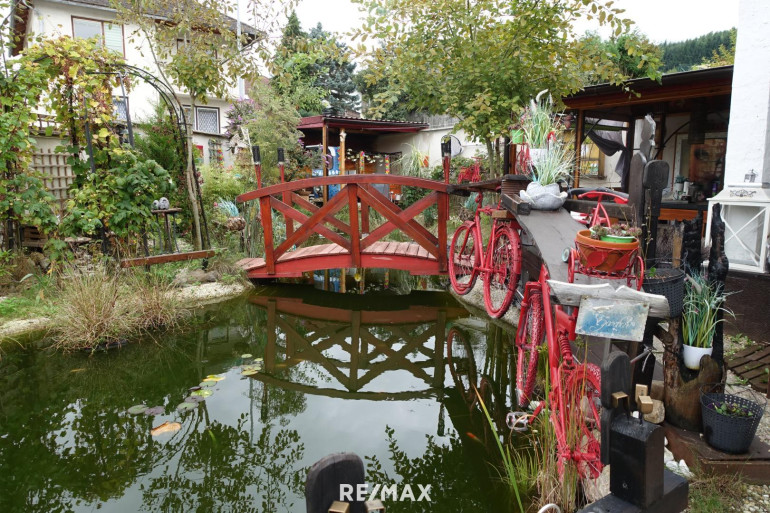 Wunderschön angelegtes Biotop mit Fischen und einer Brücke