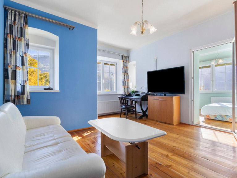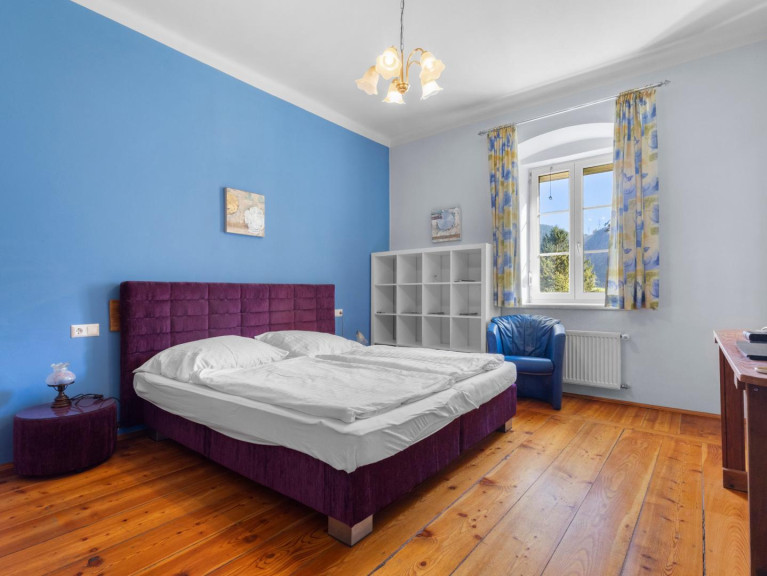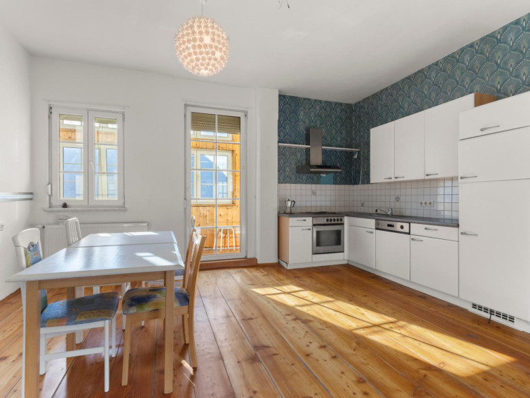 Das Gebäude gliedert sich in ein dreigeschossiges Haupthaus, das südseitig orientiert ist, und in ein zweigeschossiges Nebenhaus. Die 14 Appartments mit insgesamt 17 Zimmere sind zum Teil mit Loggia und Balkon ausgestattet. Hervorzuheben ist die Raumhöhe von 3,50 m, ein weiteres Highlight sind die wunderschönen Holzböden. Die Außenwände sind rund 70 cm dick, was für ein ganzjährig angenehmes Raumklima sorgt. Die Wohnfläche beträgt rund 460 m². Das Gebäude ist voll unterkellert. Die Nutzfläche des Kellers beträgt rund 181 m².